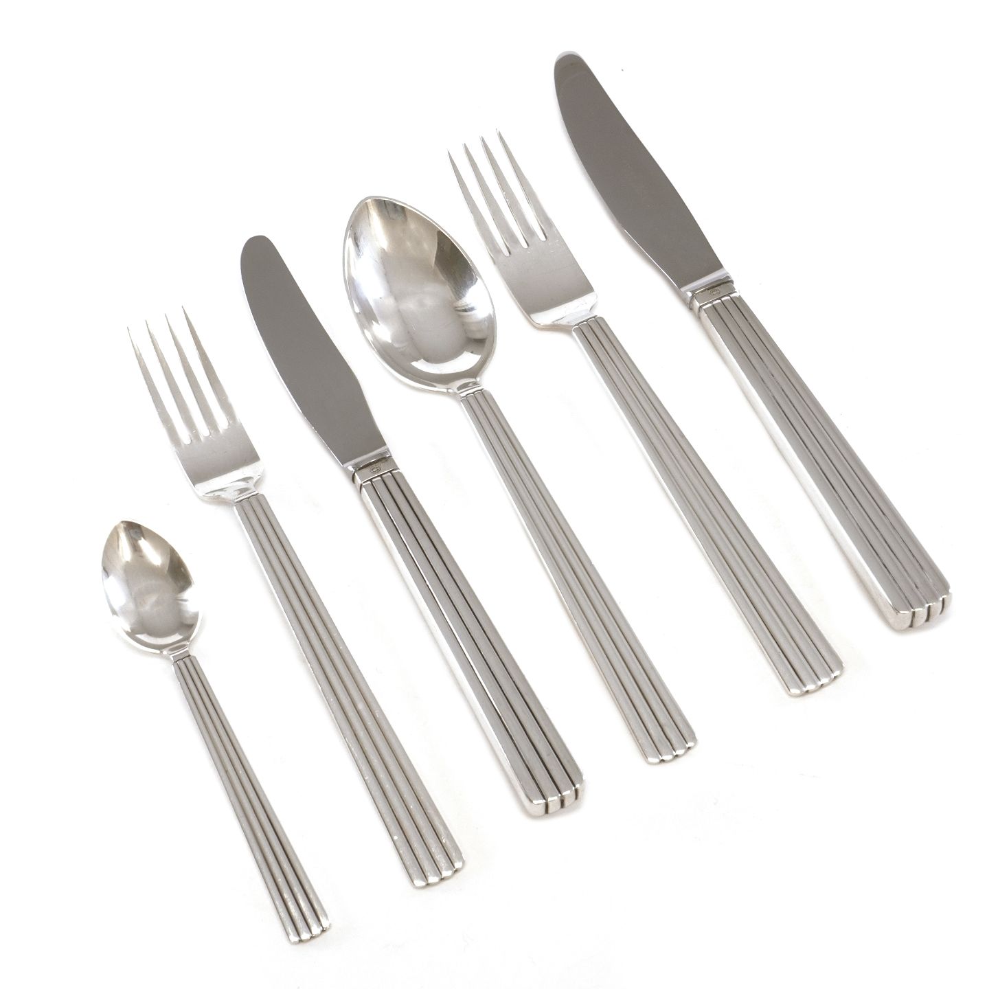 | Georg Jensen Bernadotte sølvbestik til 12 personer udført i sterlingsølv 1962 bestående af: 12 middagsknive 12 middagsgafler 12 middagsskeer 12 frokostknive 12 frokost gafler 12 teskeer I alt 72 dele Emne nummer: 673 |