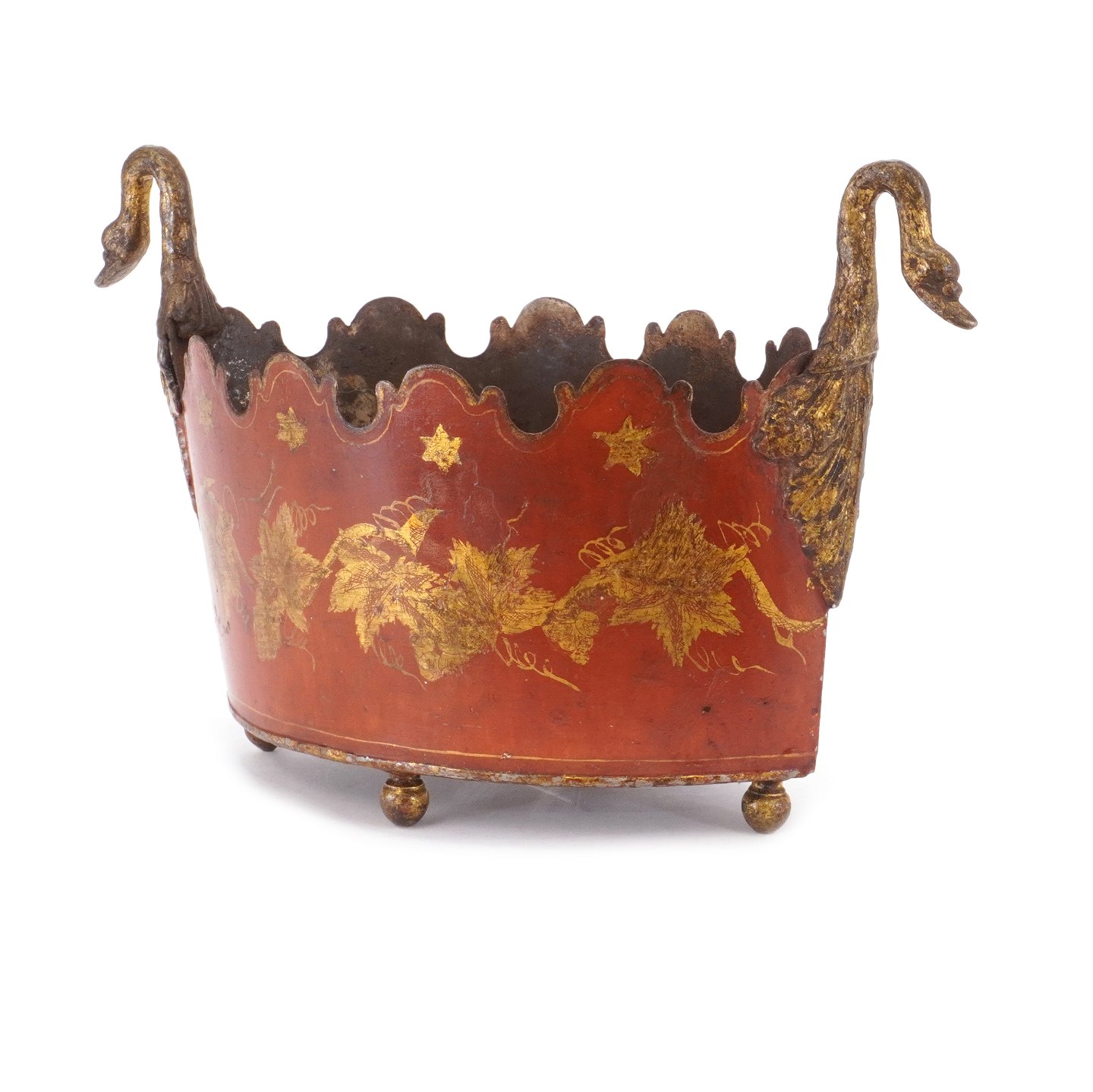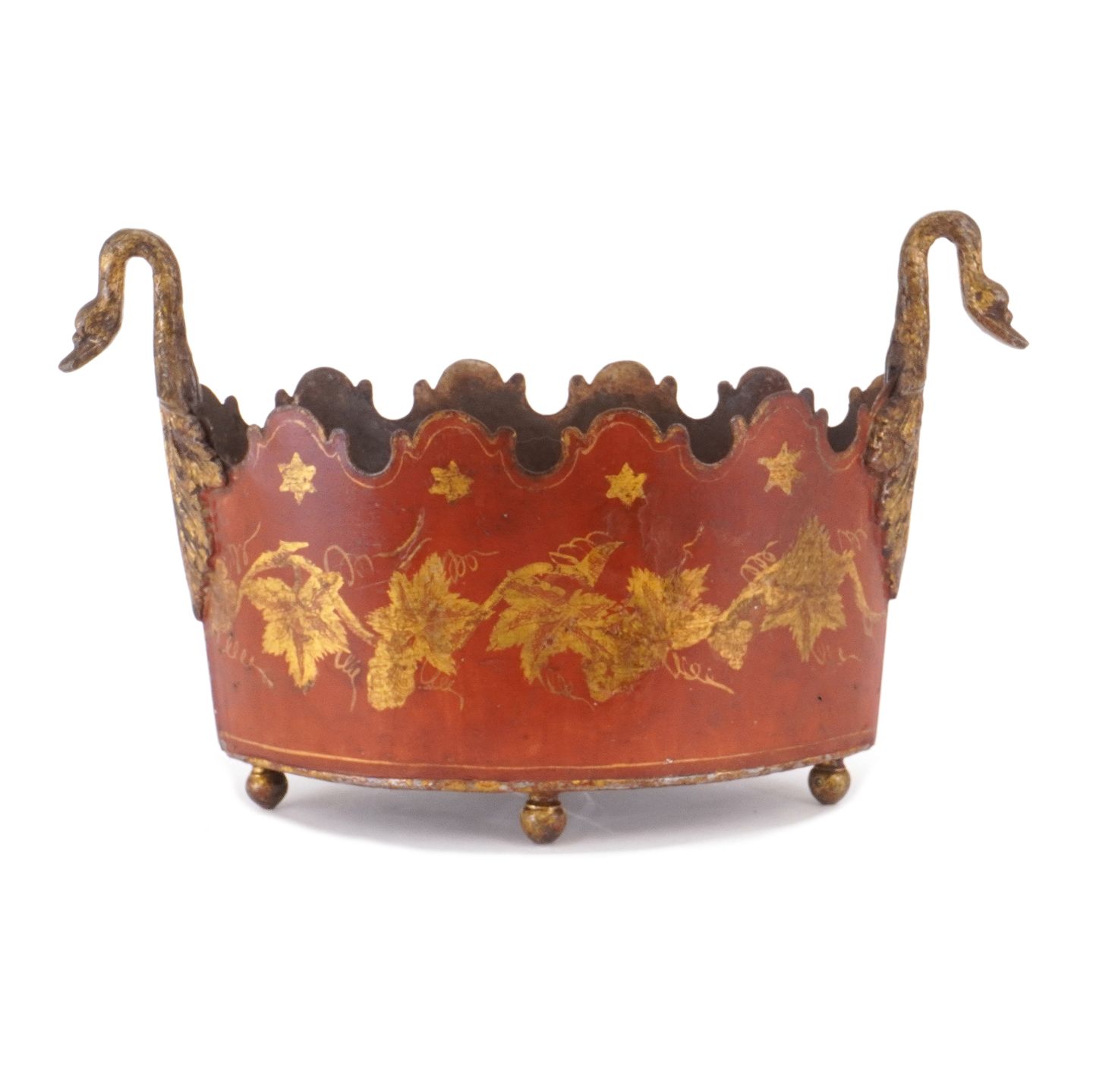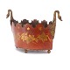 Forgyldt og røddekoreret urtepotteskjuler/jardiniere i metal