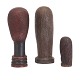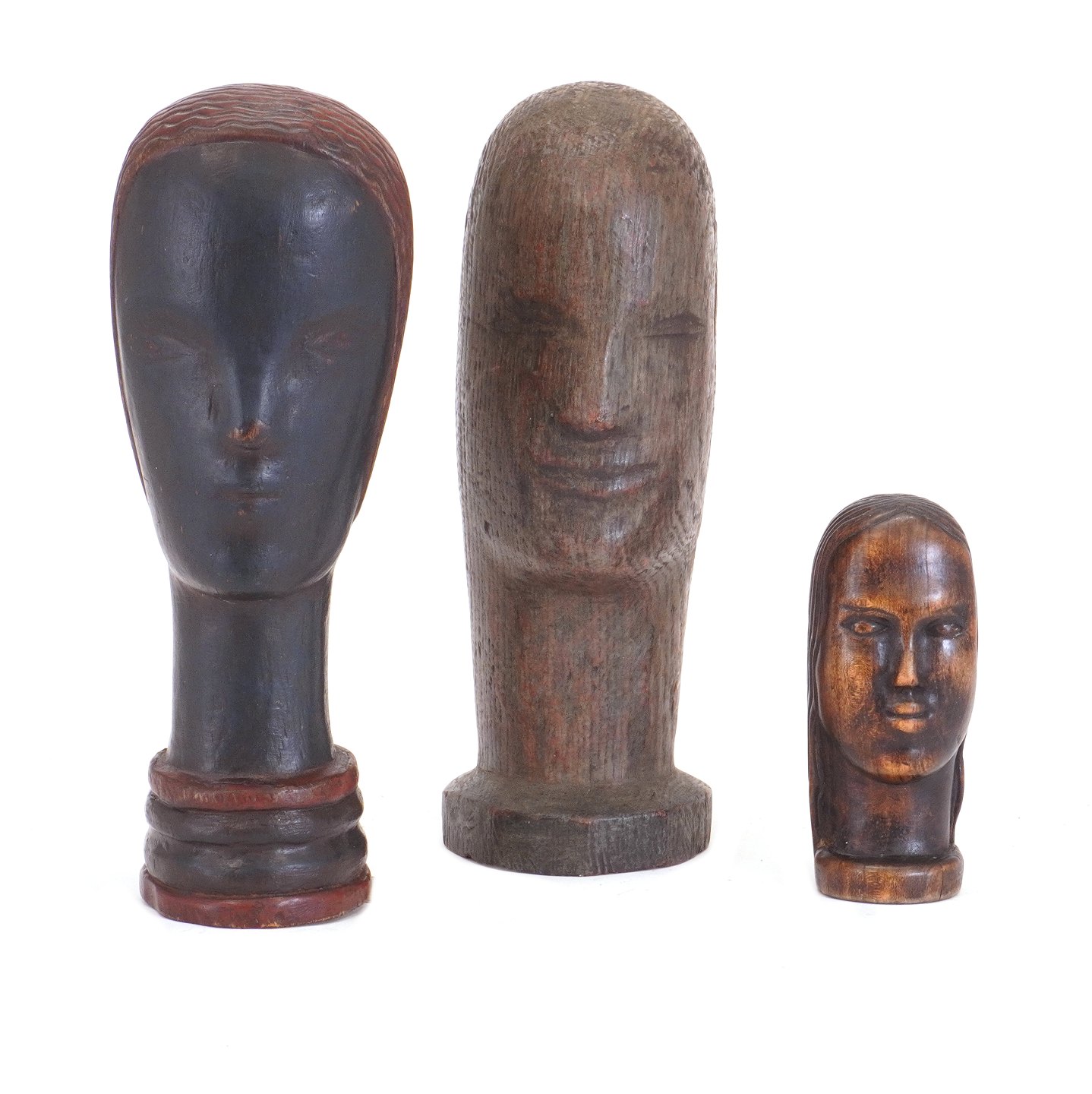 Samling på tre træskulpturer i form af hoveder udført i træ af Otto Pedersen