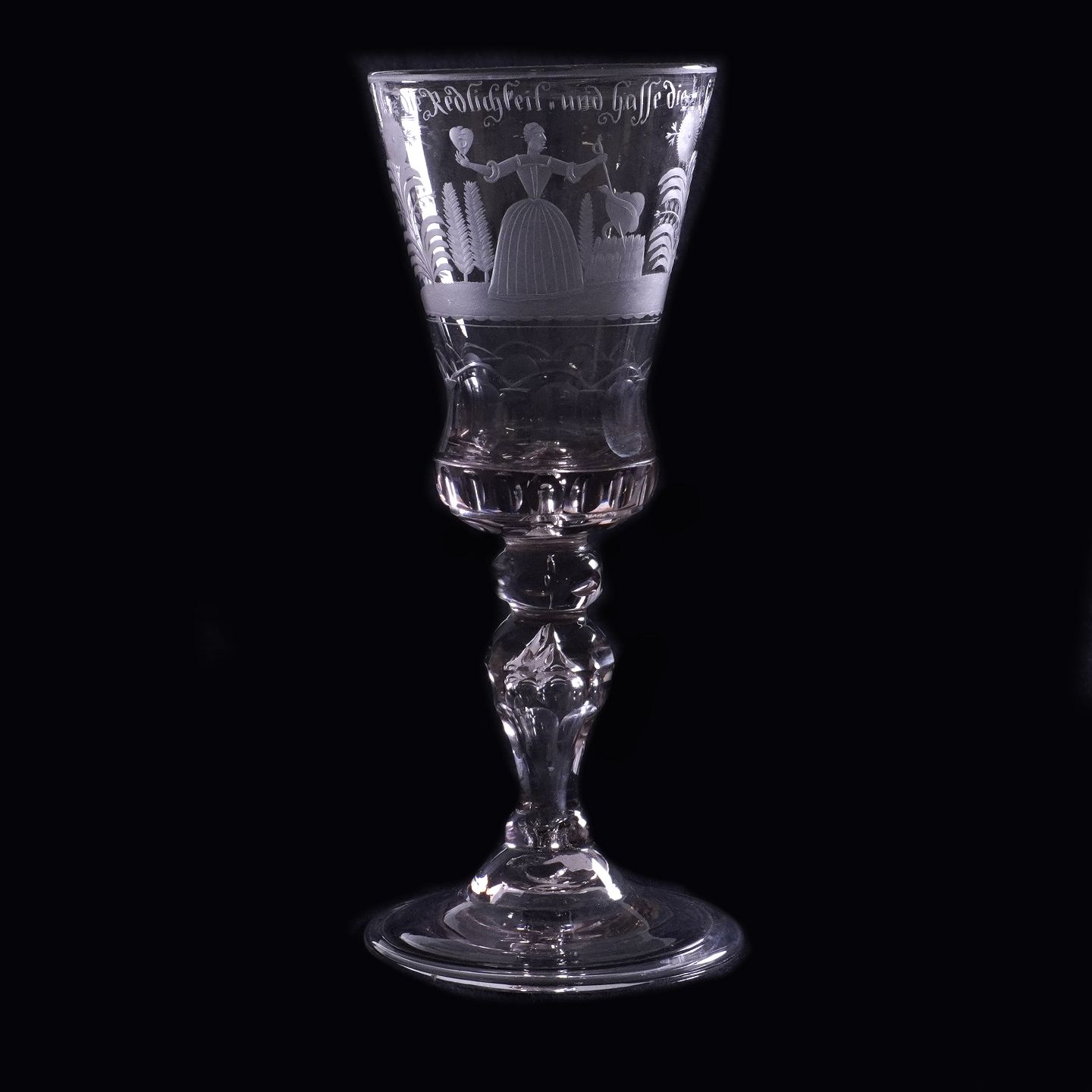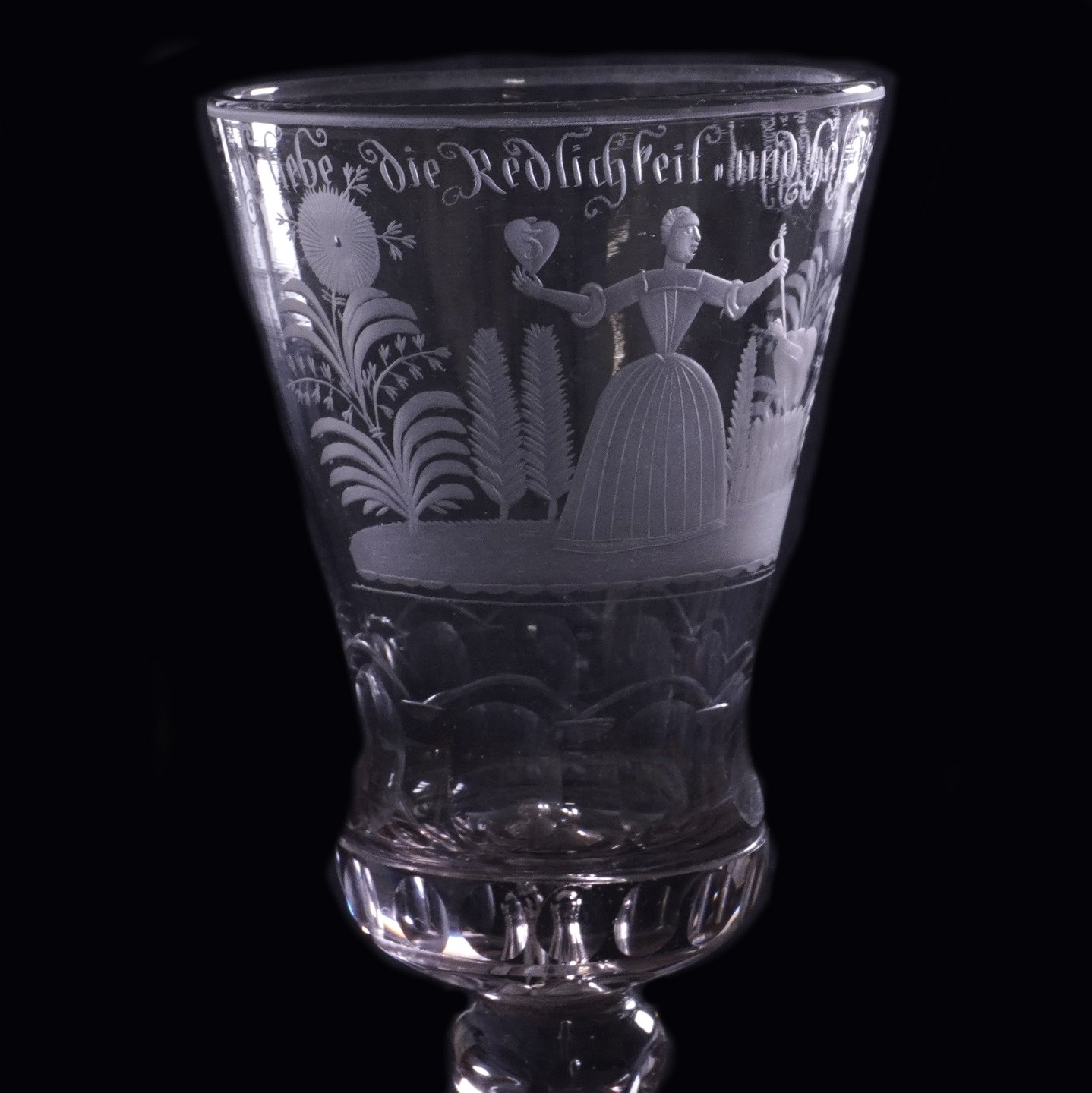 Tysk glaspokal med gravering "Ich liebe die Redlichkeit und hasse die Falschheit"