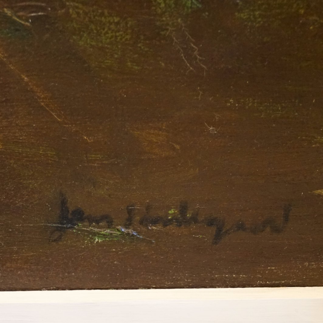 Jens Søndergaard; Landskabsmaleri med marker i forgrunden, samt tårn og hav i baggrunden. Olie på lærred.