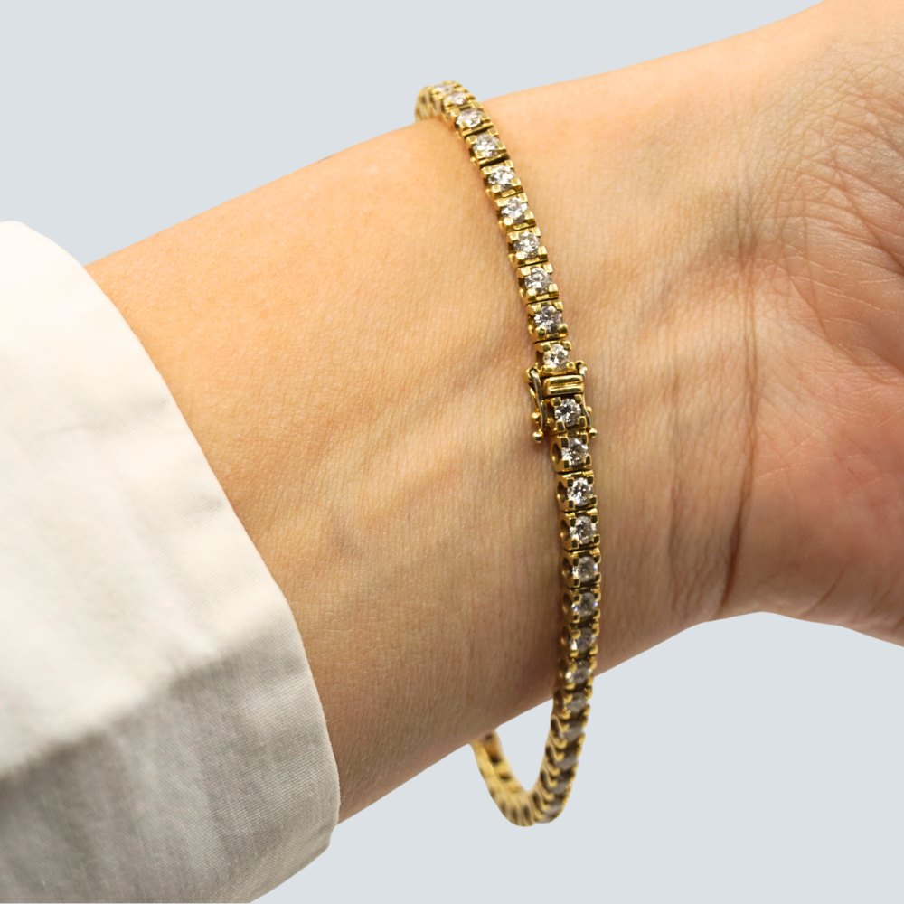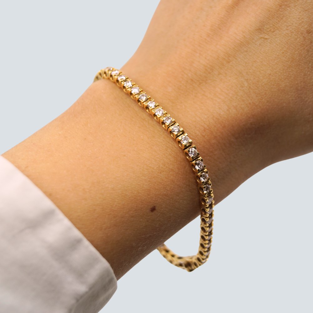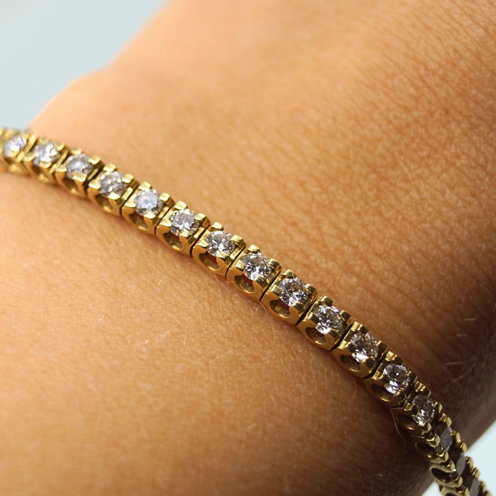 | Tennisarmbånd af 18 kt. guld prydet med 50 brillanter. Brillanter i alt ca. 3,50 ct. Top Wesselton - SI. Monteret med kasselås samt to sikkerhedslåse. Diamantarmbånd. l. 18 cm. B. 3 mm. Stemplet "18K". Diamant tennisarmbånd. Kontakt os gerne, hvis du søger noget specifikt. Hvad du ser på vores hjemmeside, er blot et udvalg af det, som vi har. |