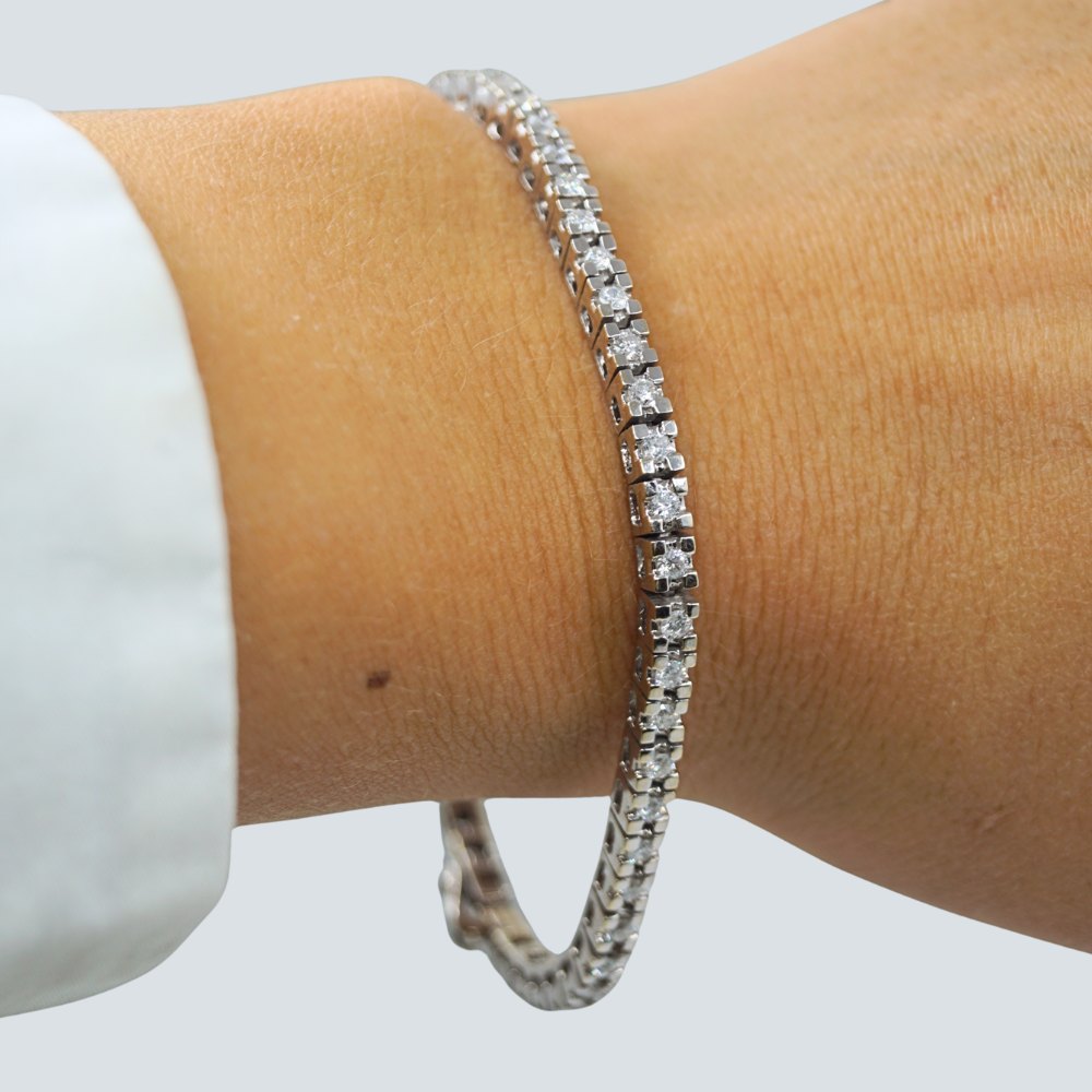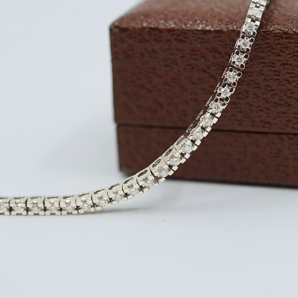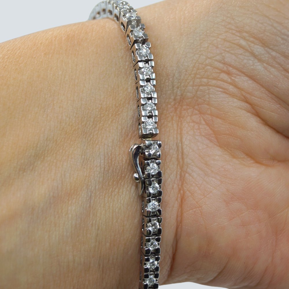 | Tennisarmbånd af 18 kt. hvidguld prydet med brillanter. Brillanter i alt ca. 1,53 ct. Wesselton - SI. Monteret med kasselås samt en sikkerhedslås. Diamantarmbånd. l. 18 cm. B. 3 mm. Stemplet "18K". Diamant tennisarmbånd. Kontakt os gerne, hvis du søger noget specifikt. Hvad du ser på vores hjemmeside, er blot et udvalg af det, som vi har. |