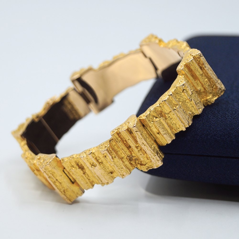 Björn Weckström for Lapponia; Leddelt armbånd af seks led i 14 kt. guld. Designet af Björn Weckström omkring 1970. L. 18 cm. b. 1,3-1,8 cm. 62 gram. Monteret med kasselås og sikkerhedslås. Stemplet "585 Finland Bjorn Lapponia"