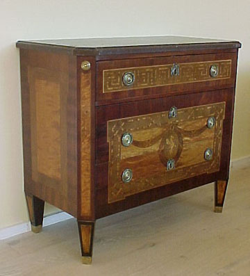 Sengustaviansk kommode med plade af rødbrun kalksten,fineret af mahogni / birketræ, indlagt med guirlander,engle og lister af lyst og farvet træ, beslag af støbt bronce.
