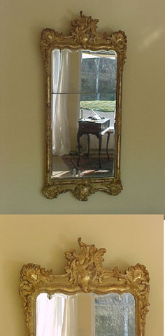 Dansk / Nordtysk rococo spejl i ramme af forgyldt træ, rigt udskåret med blomster, rocailler og bladværk, todelt facetteret spejlglas, ca. 1750-60