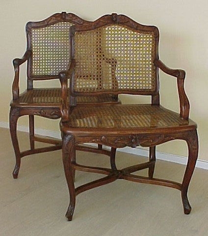 Par franske regence armstole af nødetræ, udskåret med rosetter og akantusbladværk, originalt rørflæt i sæder og ryg.