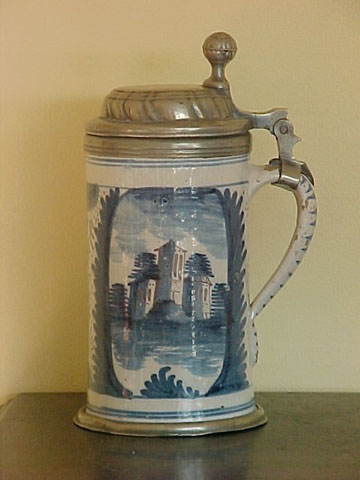 Lågkrus af fajance, dekoreret med huse i landskab, i mangan og blåt,låg og fodrand af tin, H. 24cm