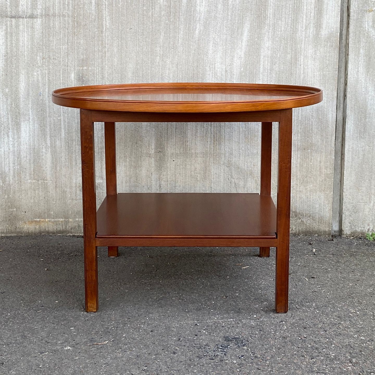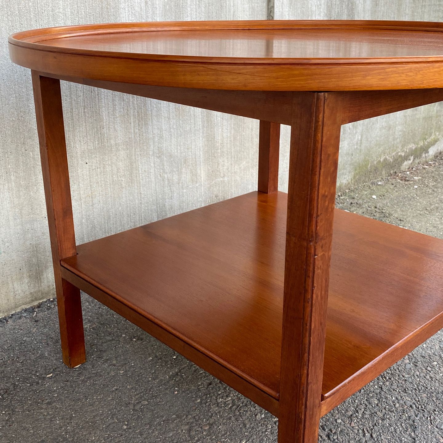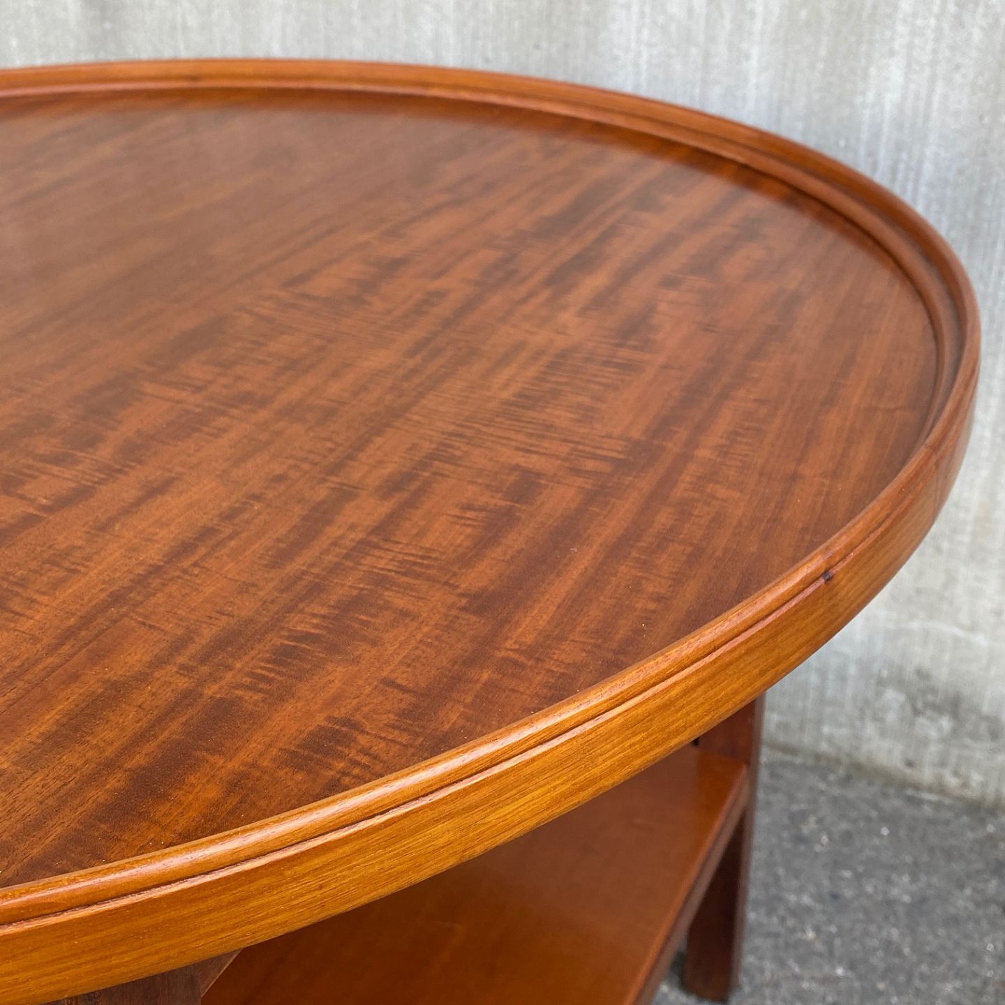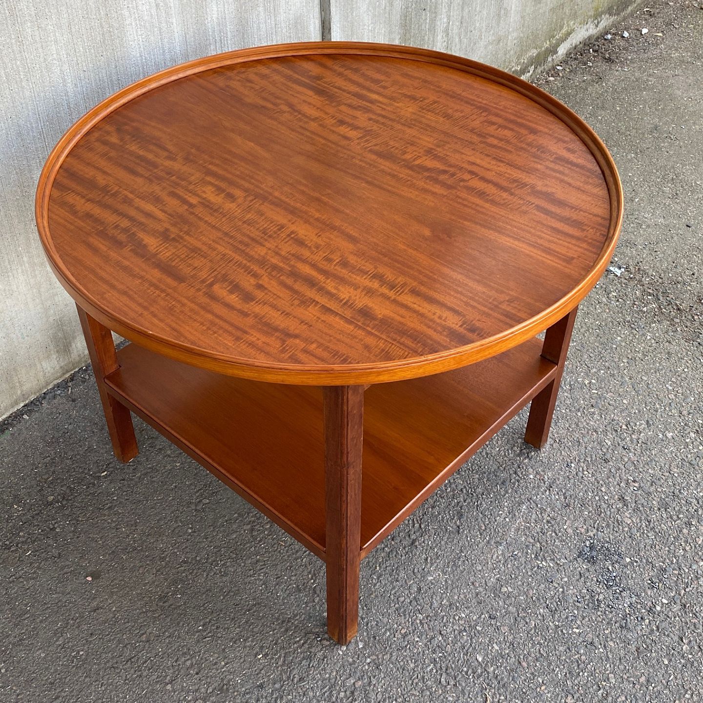| Kaare Klint sofabord, udført i massiv Cuba-mahogni hos Rud. Rasmussen. Bordet er en tidlig model der er yderst sjælden. Der er detaljer i underkanten af bordet og måden hylden er understøttet der er helt forskellig fra normalt. Mål: 75cm i diameter ,56cm høj. God brugt stand. Emne nummer: NT10 |