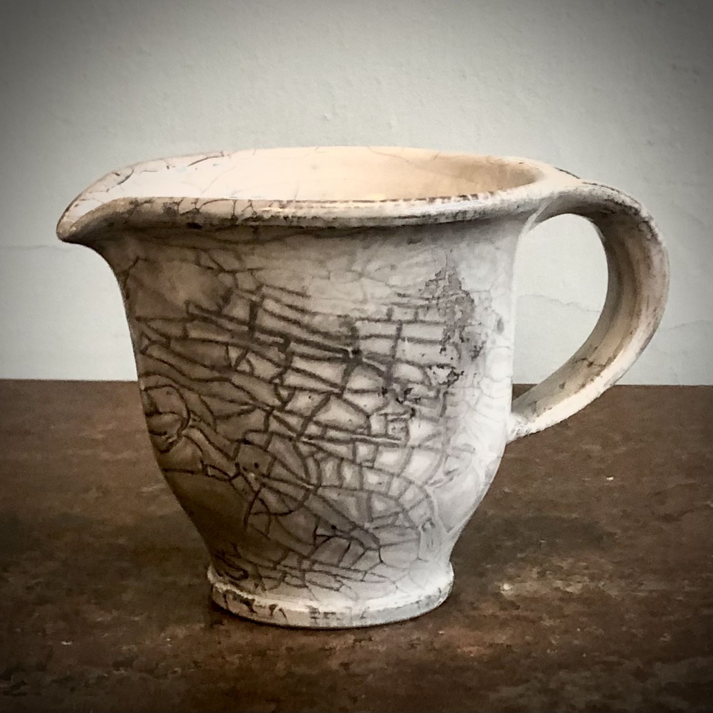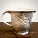Käler kande med hvid askeglasur H.13 cm. Ø 13/20 cm cm. Fremstår med små chip på bundran. Inridset HAK i Bunden.