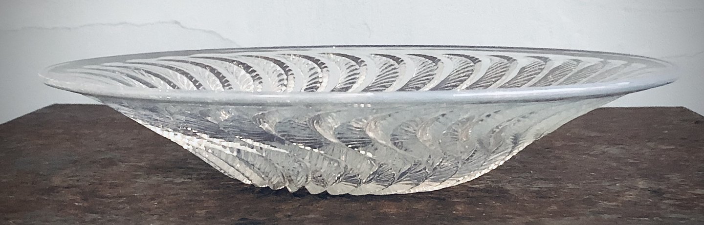 Rene Lalique rundt fad af klart glas med let blålig toner. Støbt med bladværk i relief. Signeret R. LALIQUE FRANCE. H. 5 cm. Ø 25,5 cm. Fin stand.