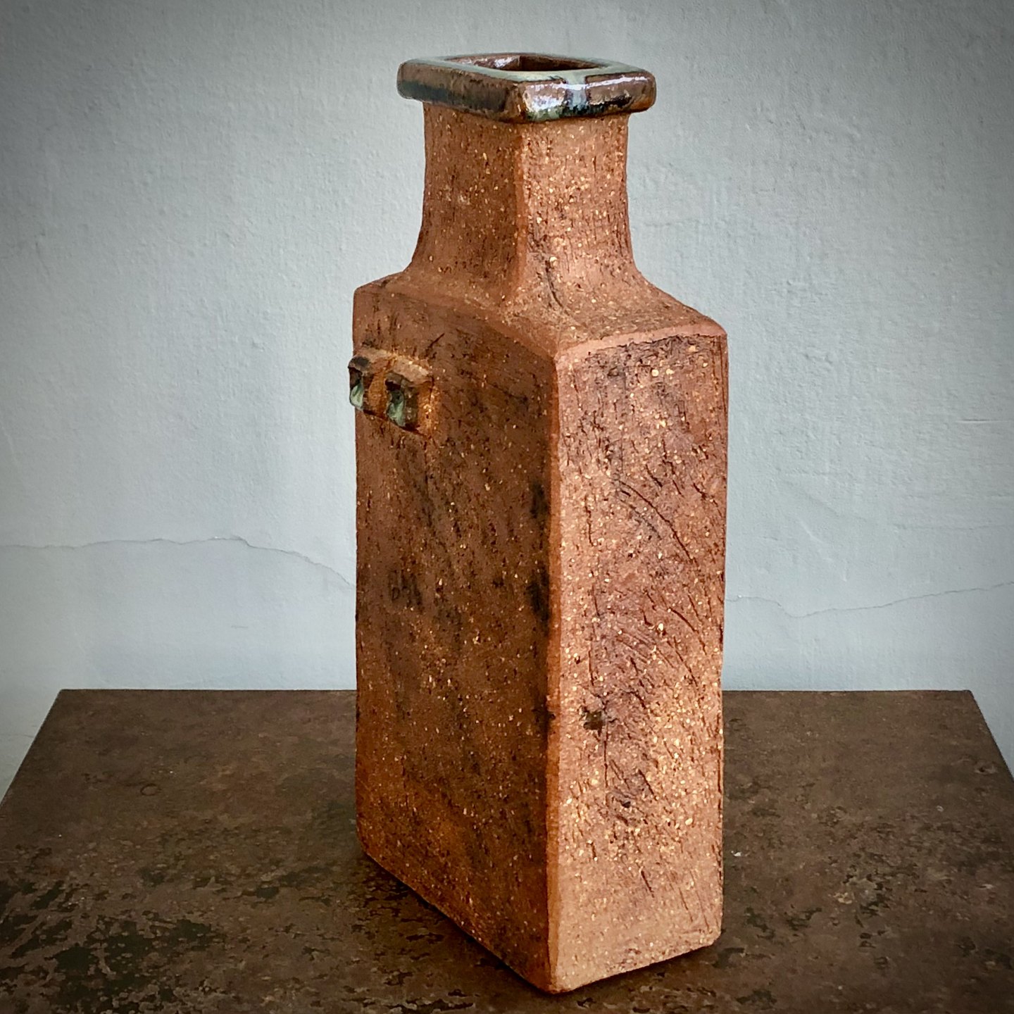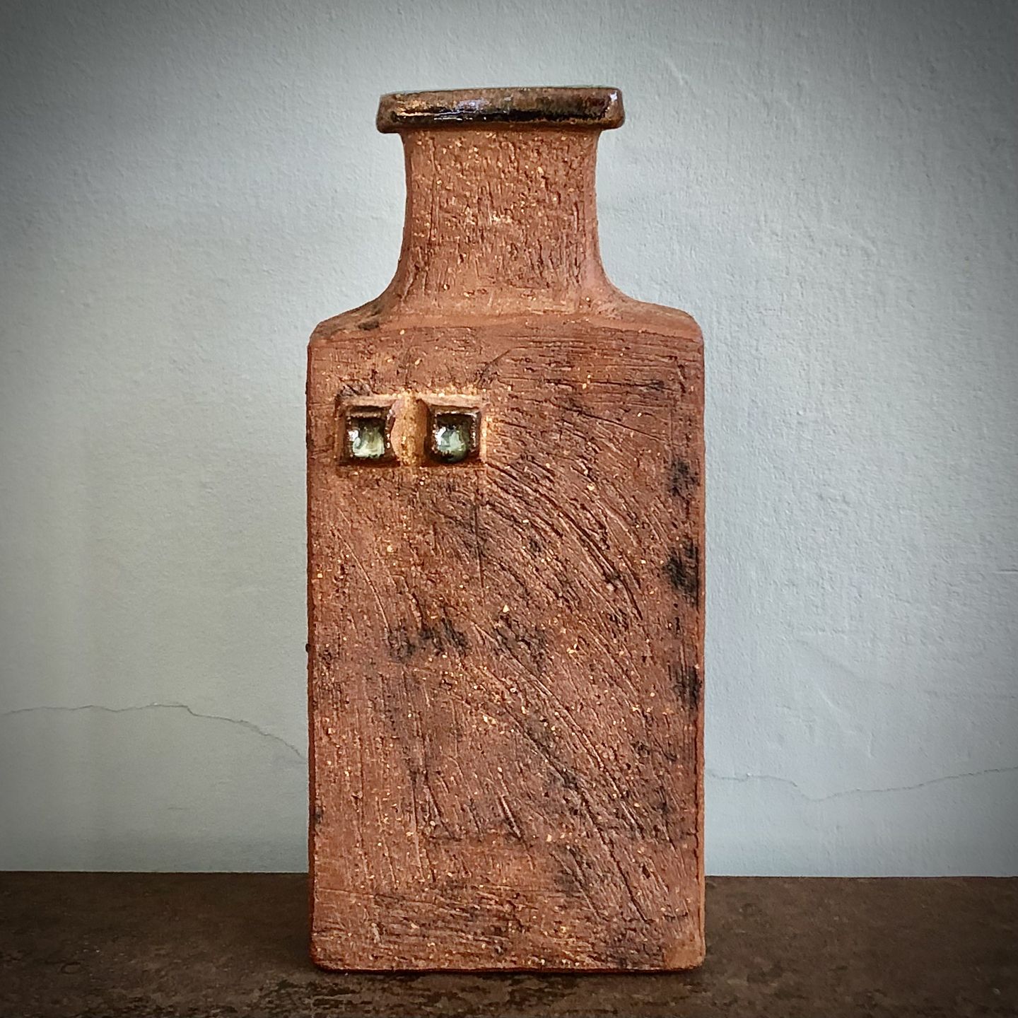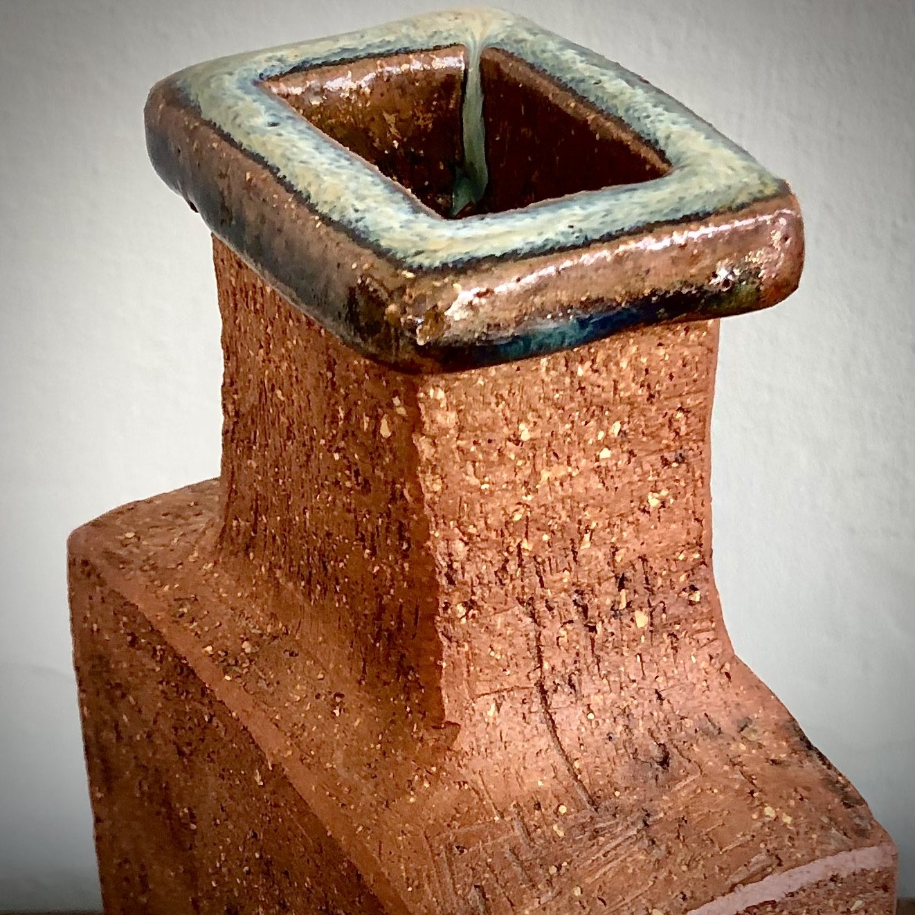 | Curt M Addin Glumslov Vase af stentøj. Munding med flerefarvet (Blågrøn og hvid) glasur H. 29,5 cm. B. 13 cm. D. 6,5 cm. Signeret i bunden Curt M Addin, Glumslov Sweden. Emne nummer: #135 |