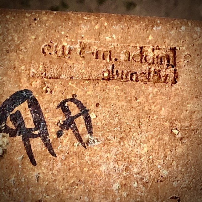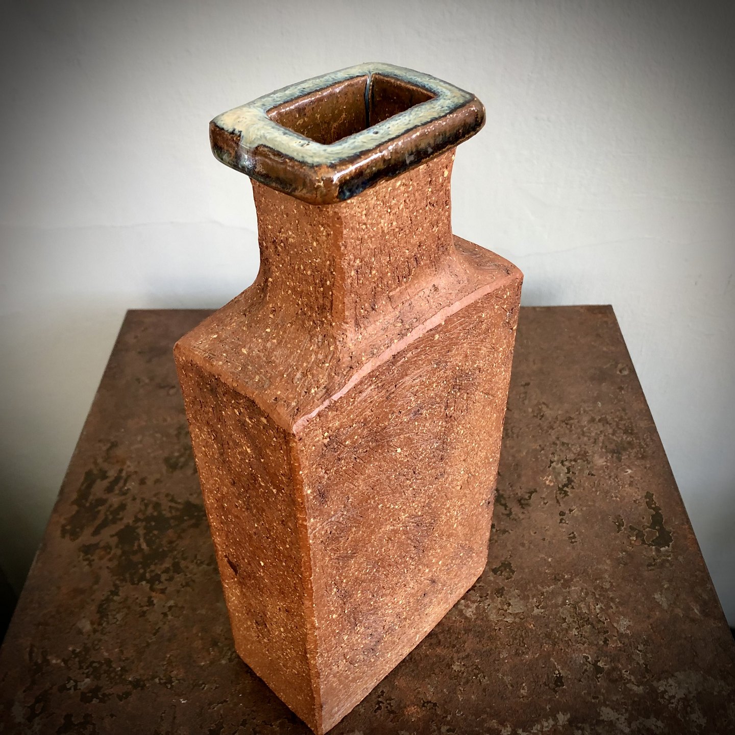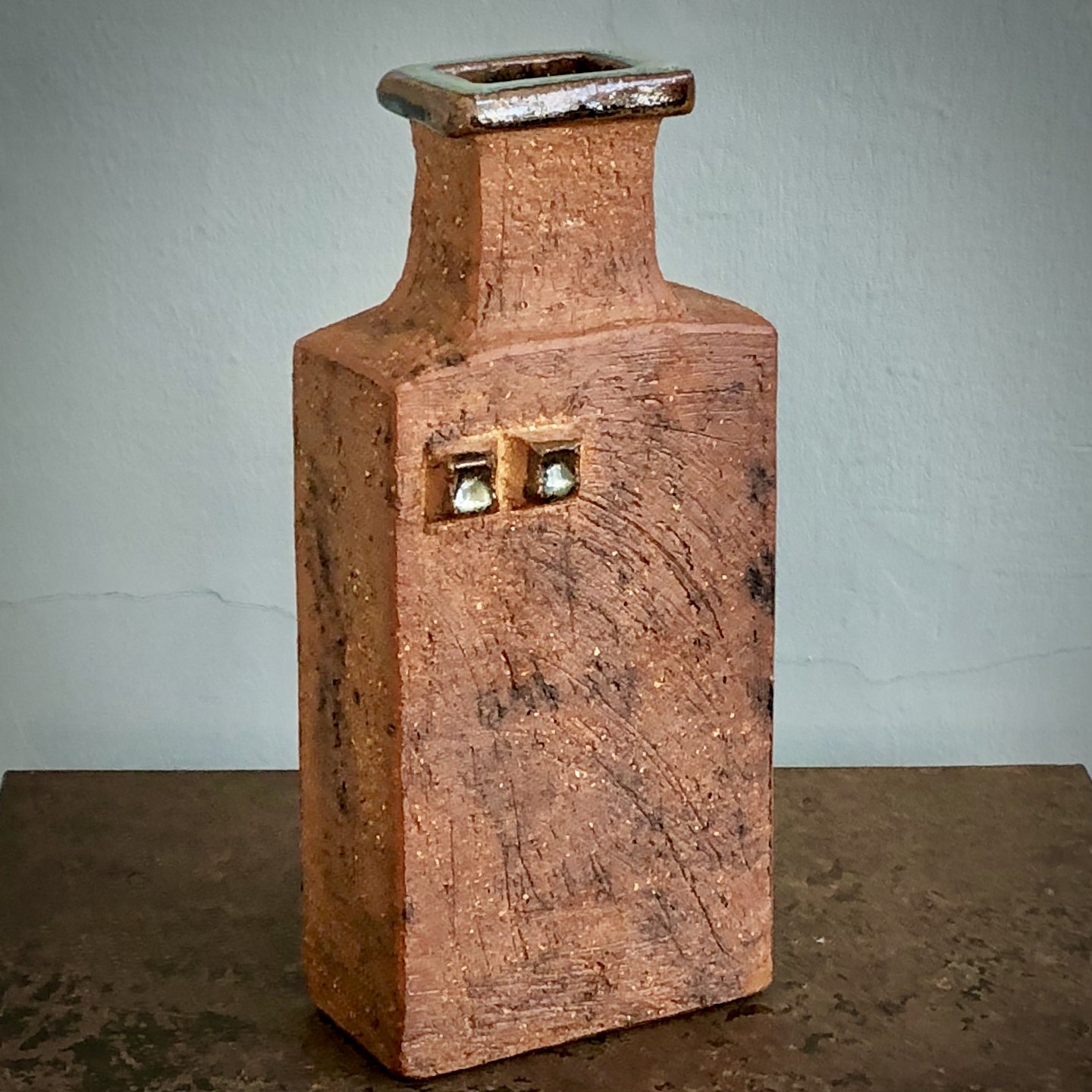 | Curt M Addin Glumslov Vase af stentøj. Munding med flerefarvet (Blågrøn og hvid) glasur H. 29,5 cm. B. 13 cm. D. 6,5 cm. Signeret i bunden Curt M Addin, Glumslov Sweden. Emne nummer: #135 |