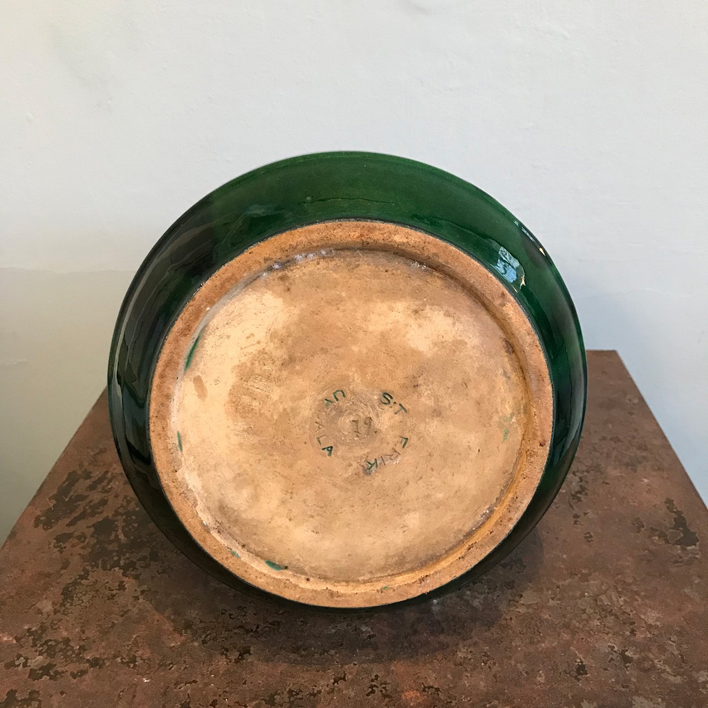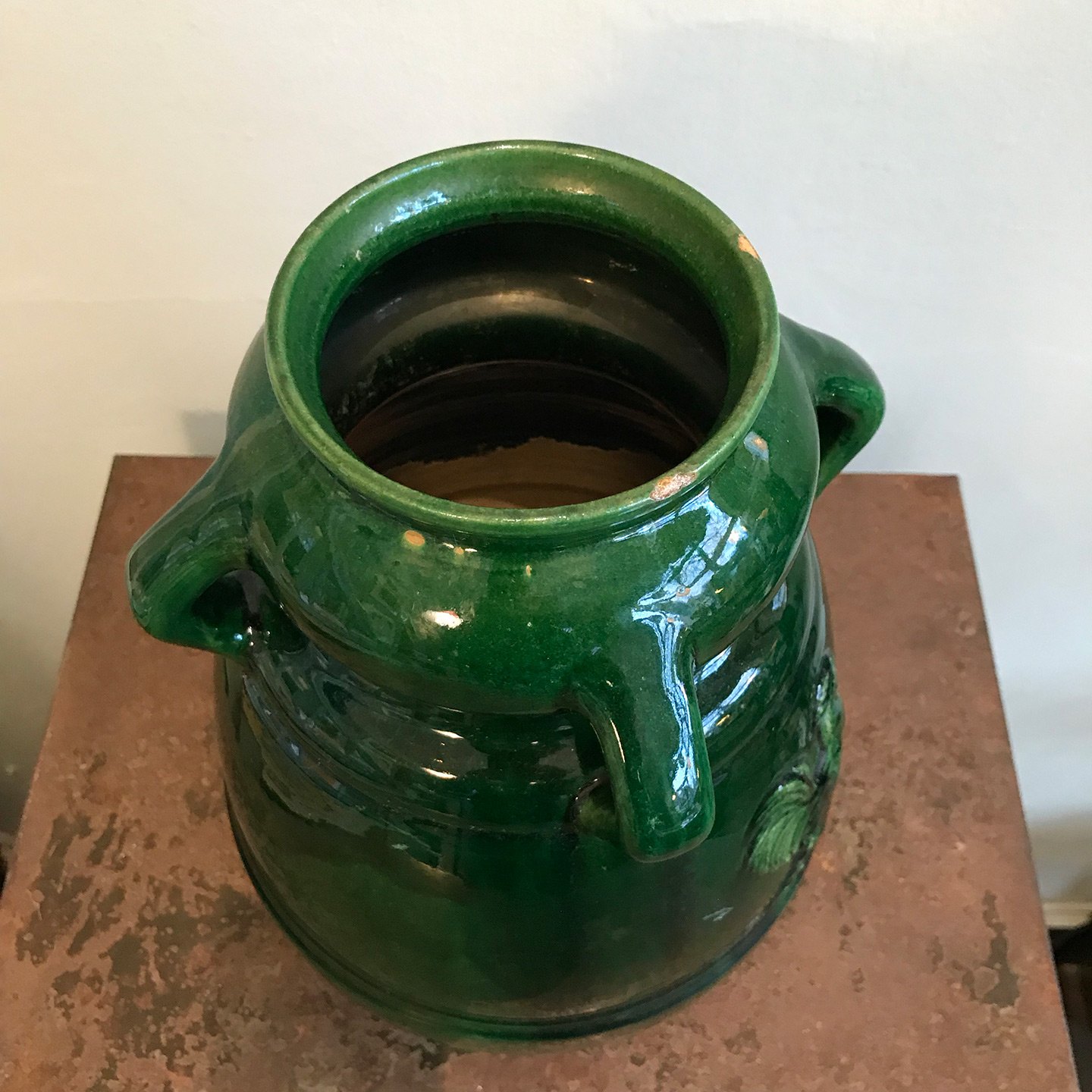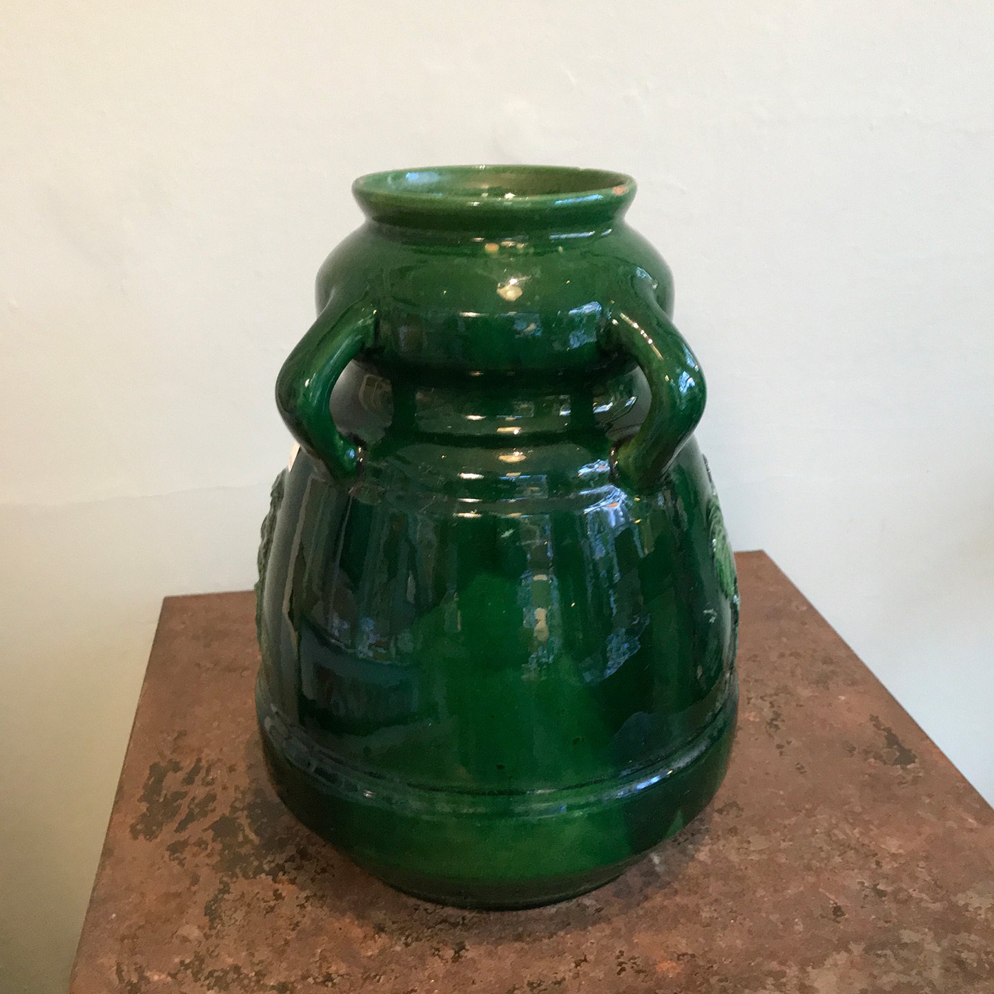 Stor lertøjs vase fra S:t Eriks i Upsala med grøn glasur, 4 hanke og relief motiv af 3 ugler på den ene side og en hane på den anden.