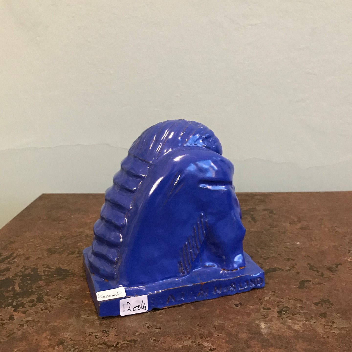 Skupltur i blåt glaseret keramik udført og signeret af den svenske kunstner Stefan Morlind.