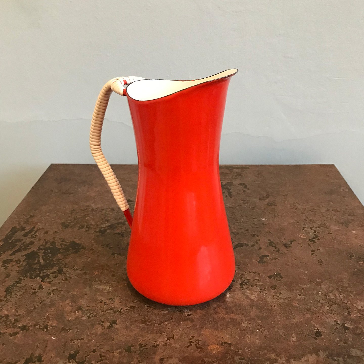 Jens Harald Quistgaard. Købenstyle Kande med rød emalje og hvidemaljeret indvendig.Hank med flet af hvid plast. H. 18 cm. Fremstår i pæn brugt stand