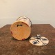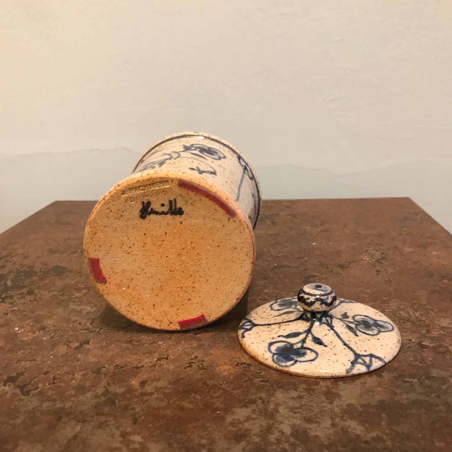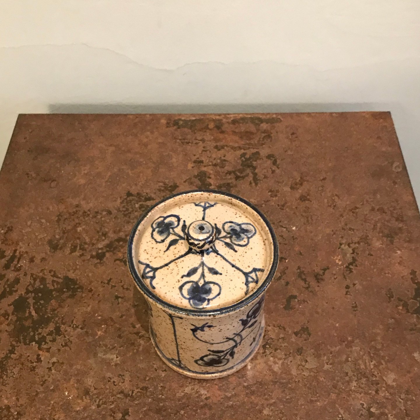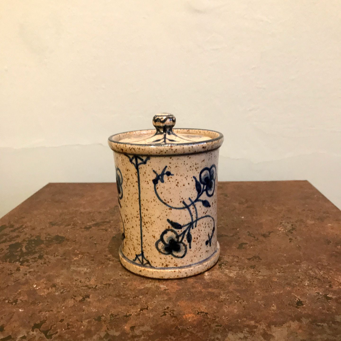 cylinderformet krukke med låg af lertøj. Dekoreret med musselmalet mønstre. H. 12,5 cm. Ø 9 cm