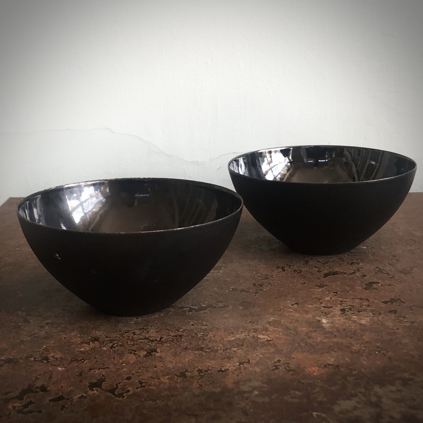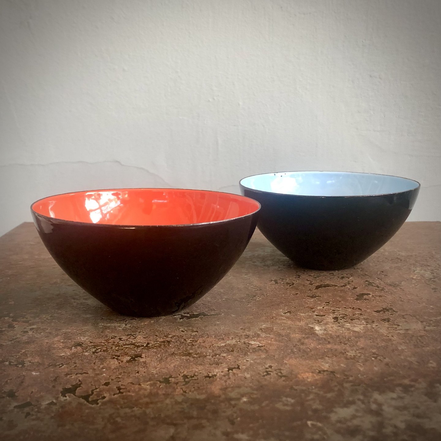 | Herbert Krenchel Krenitskåle af metal. Bestående af: #170 Skål med blank emalje og indvendig med blå blank emalje. H. 6 cm. Ø 12,5 cm. Pris 700kr #171 Skål med blank emalje og indvendig med orange blank emalje. H. 6 cm. Ø 12,5 cm. Pris 700kr #172 Skål med mat sandblæst emalje og indvendig med sort blank emalje. H. 6 cm. Ø 12,5 cm. Pris 700kr #173 Skål med mat sandblæst emalje og indvendig med sort blank emalje. H. 6 cm. Ø 12,5 cm. Pris 650 kr Formgivet i 1953-1966. Alle skåle er stemplet i bunden., Krenit. Fremstår med almindelige brugsspor og priserne afspejler standen Emne nummer: #170#171#172#173 |