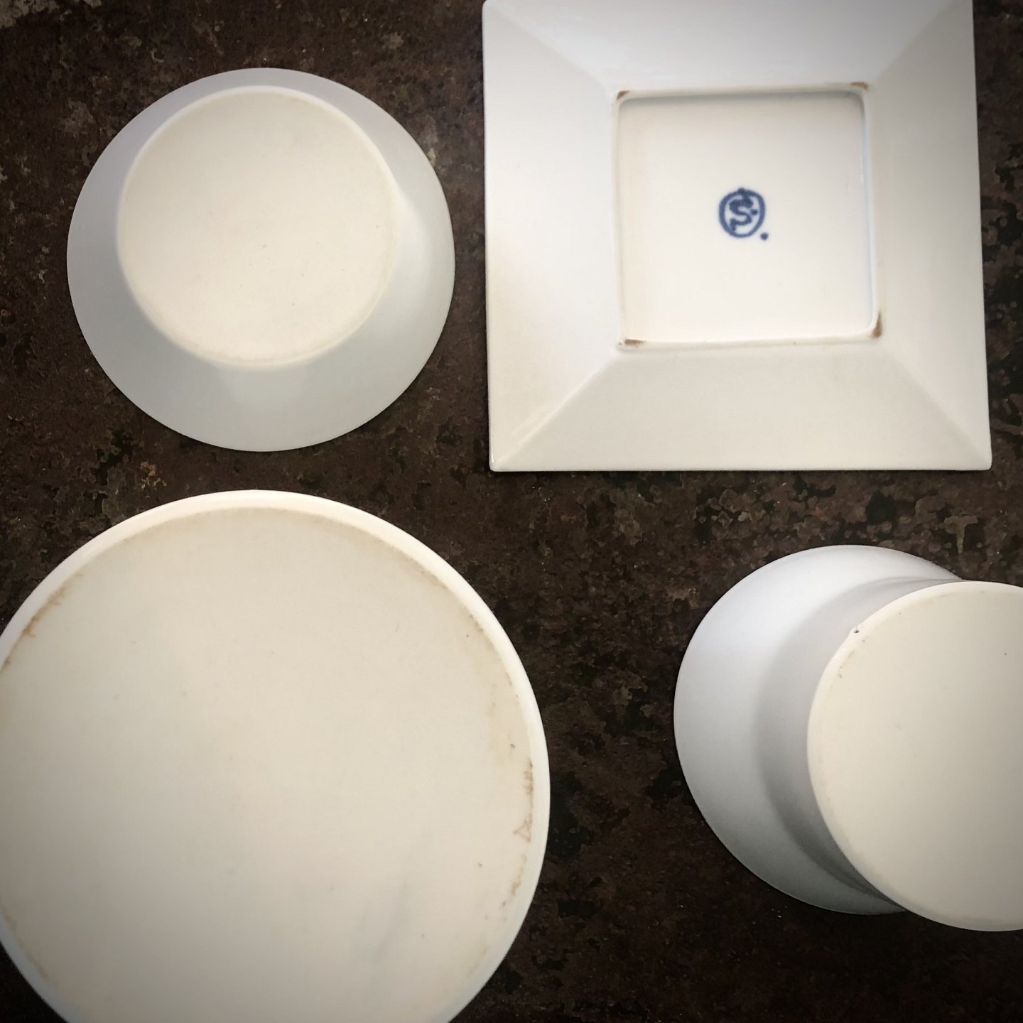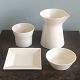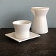 | Vandkaraffel og kop af porcelæn. Timeformet Vandkaraffel med låg H. 15 cm. Ø top 12 cm, bund 11 cm. Kop eller vandbægere med underkop: Bægere H. 8 cm. Ø 7,5 cm. Kvadrisk underkop mål: 3,5 x 3,5 cm. Signeret med blåt monogran i bunden S. Emne nummer: #185 |