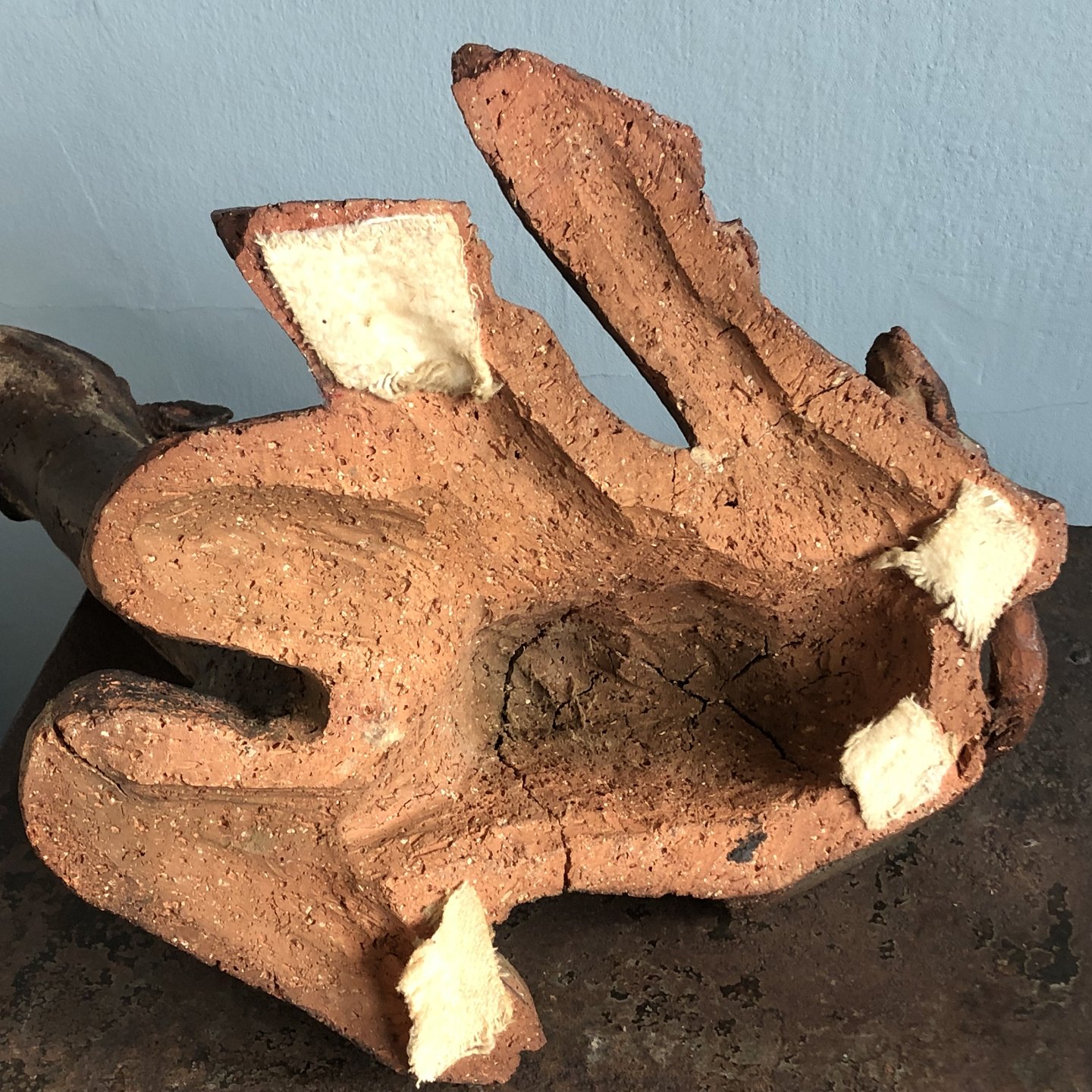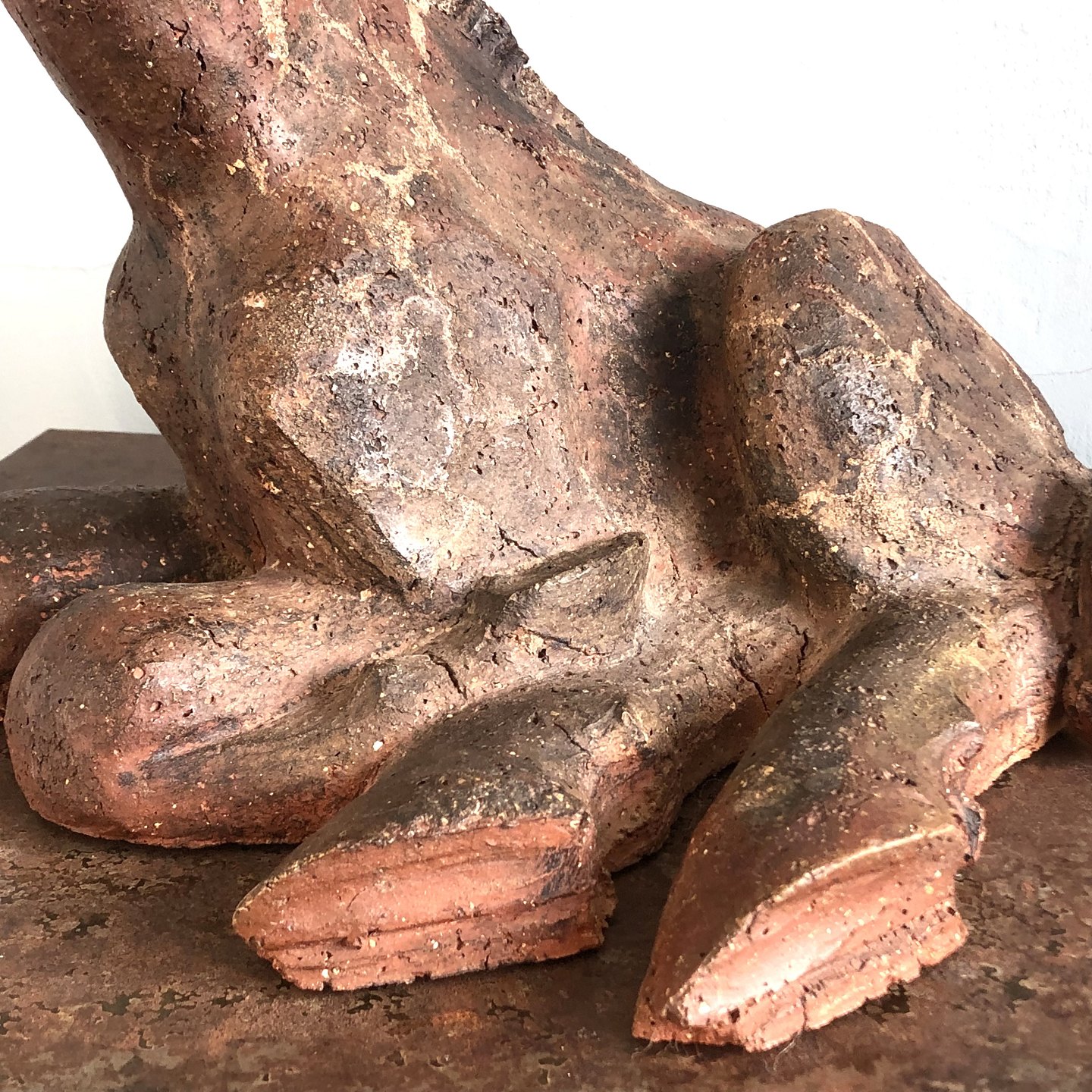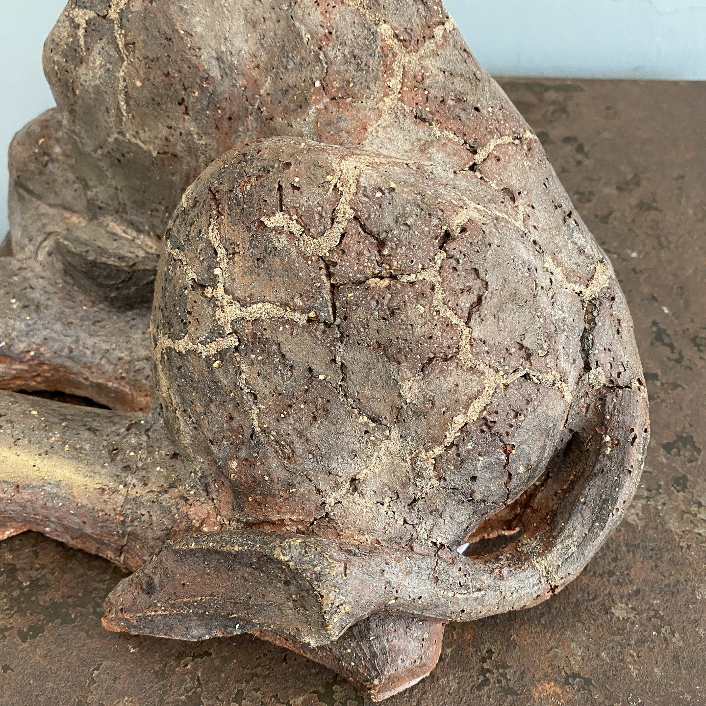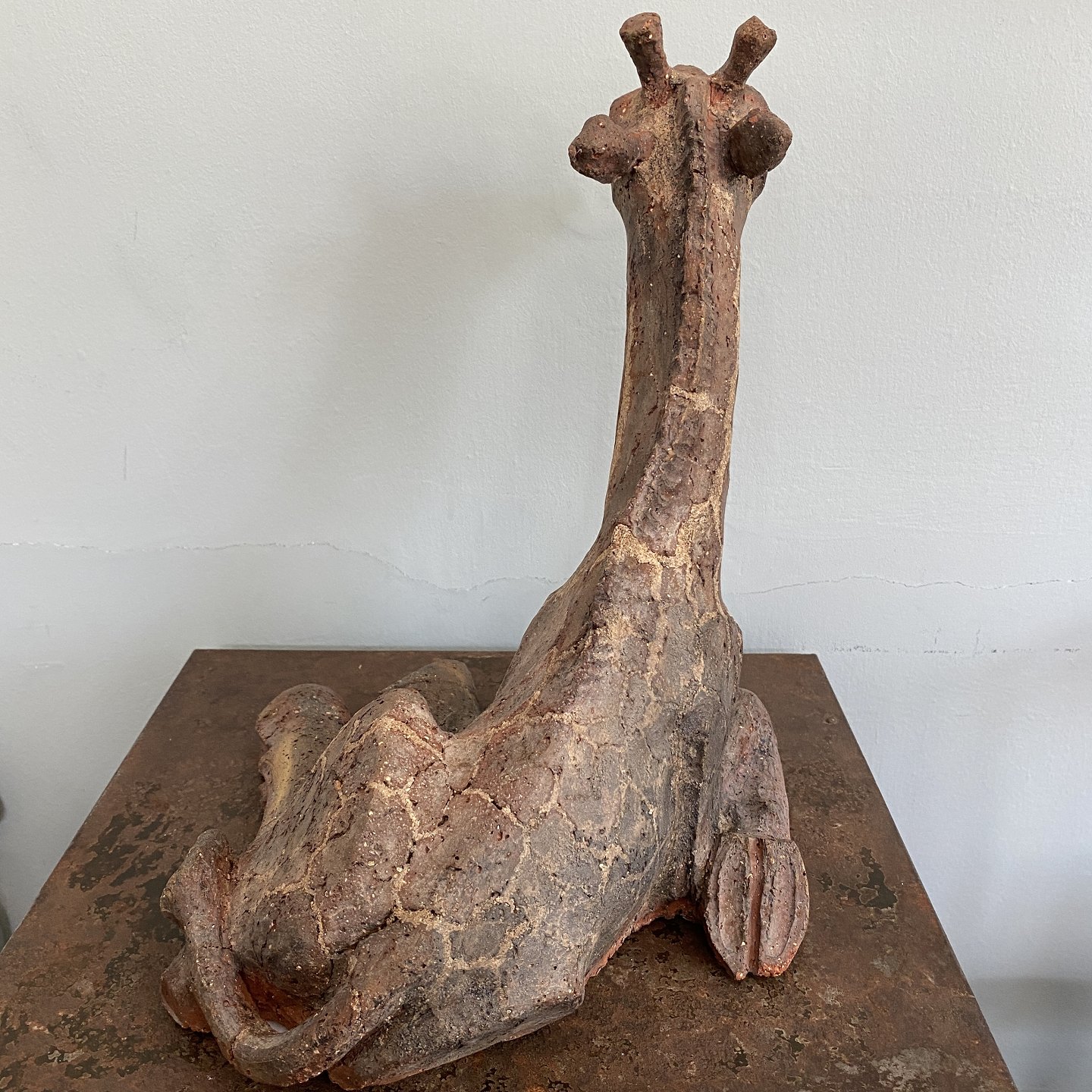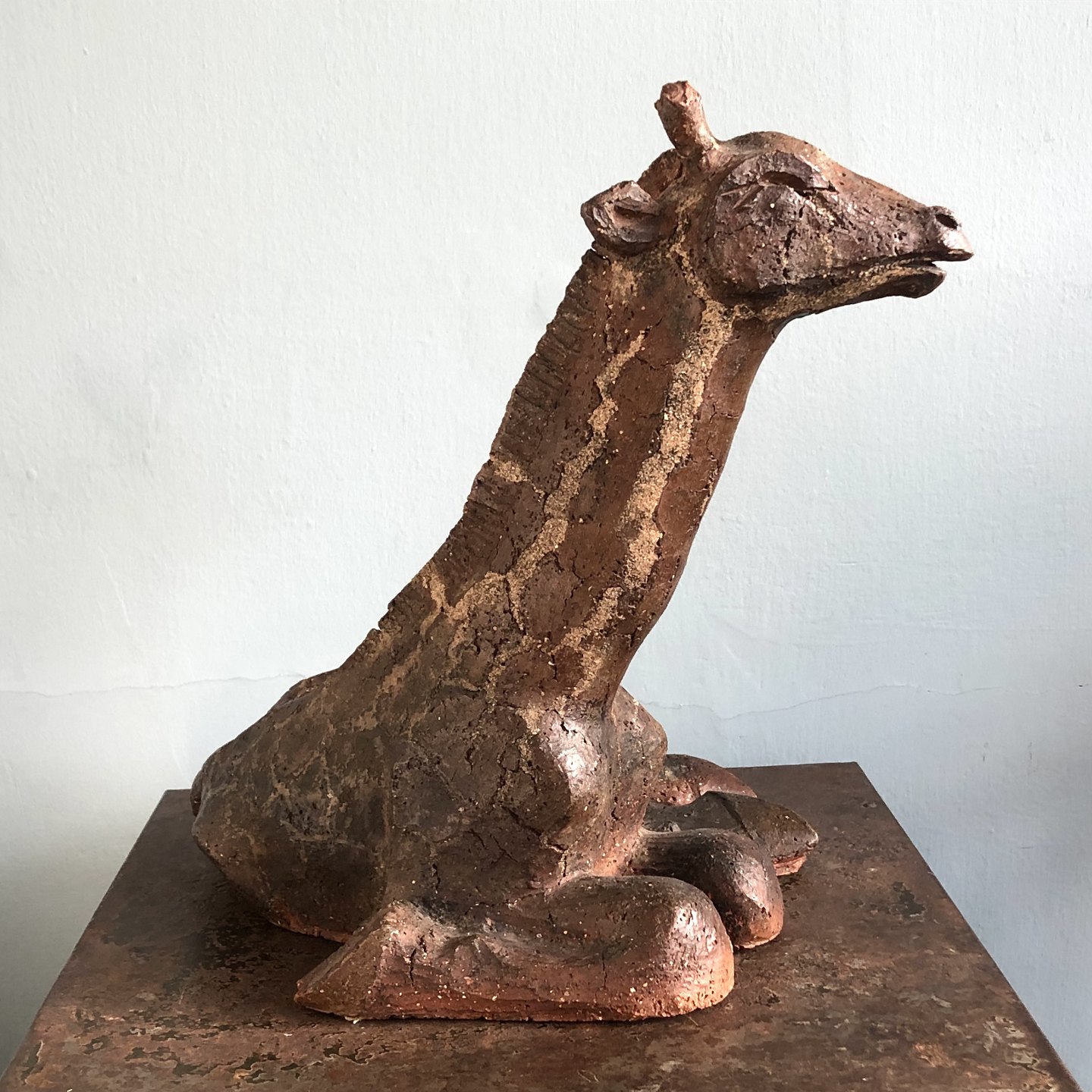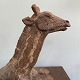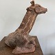 Stor liggende giraf af uglaseret stentøj.