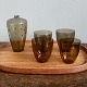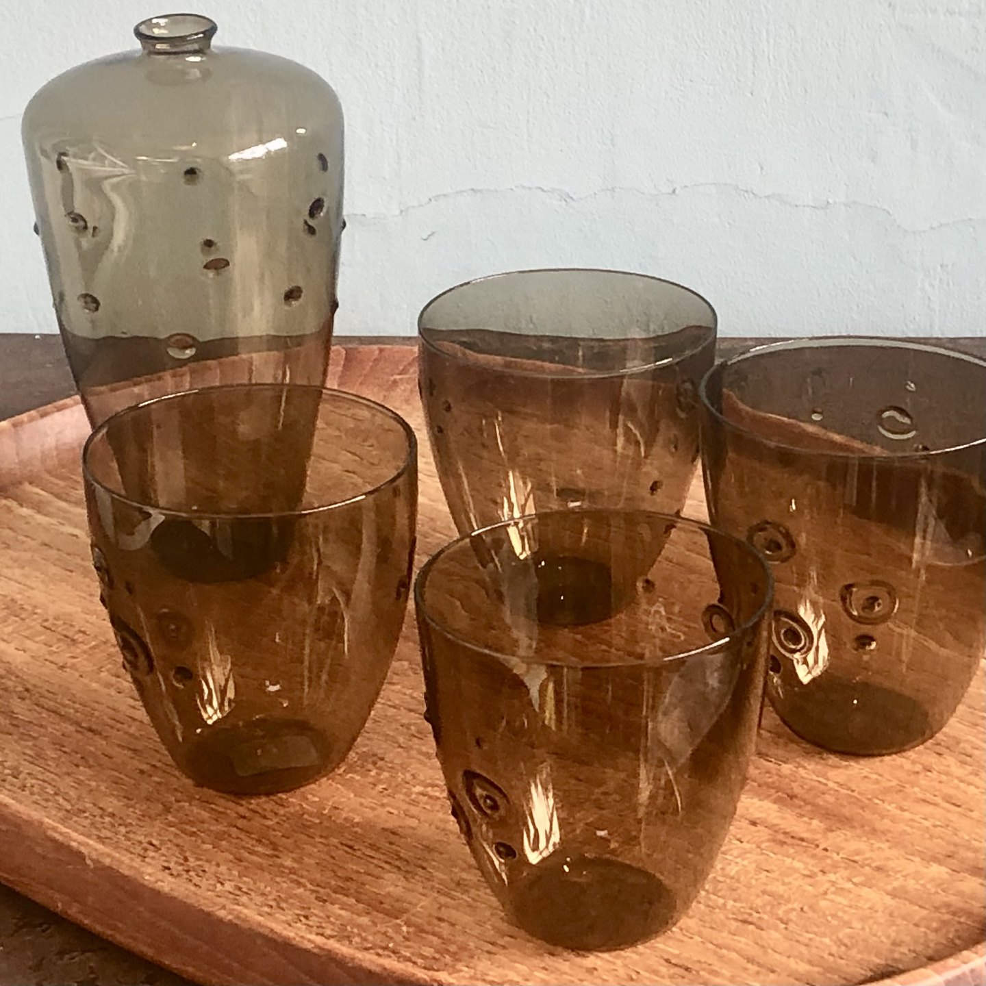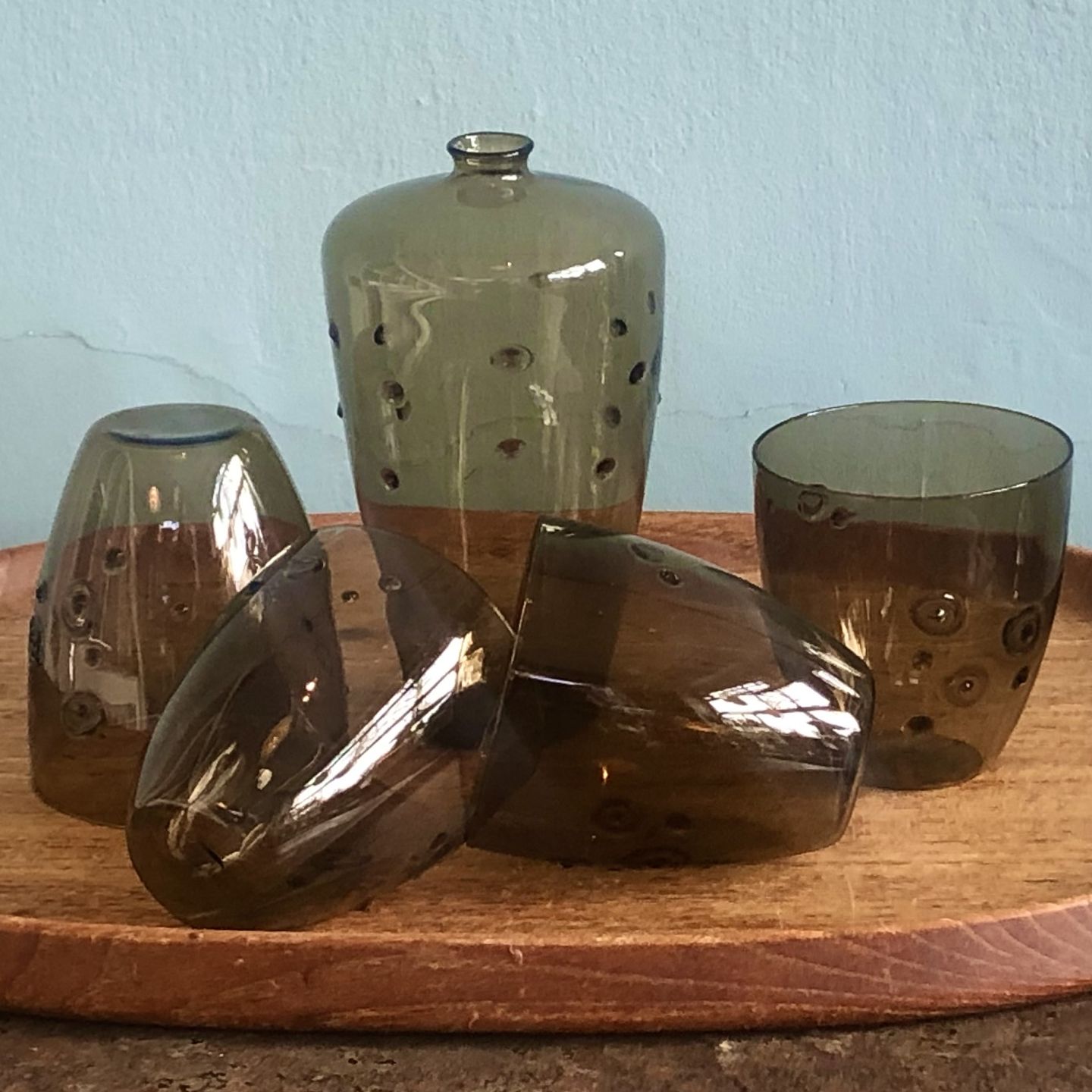 Flakon med drikkeglas af røgfarvet tyndt kunstglas med cirkler i releif.