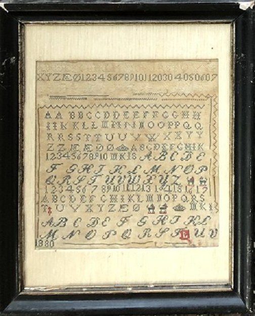 Navneklud fra 1880. Korsstingbroderi med talrække og alfabetet i sort træramme med passepartout.