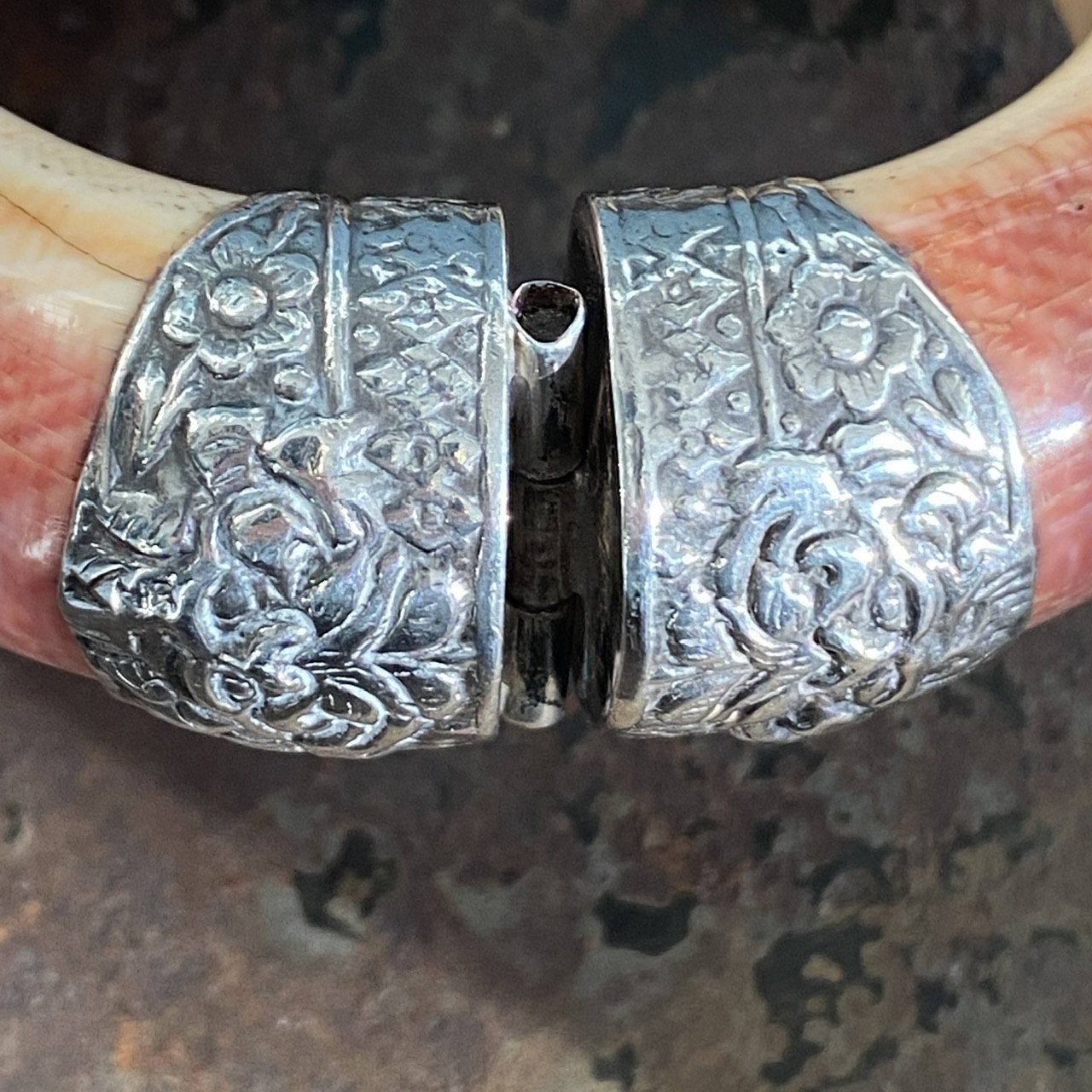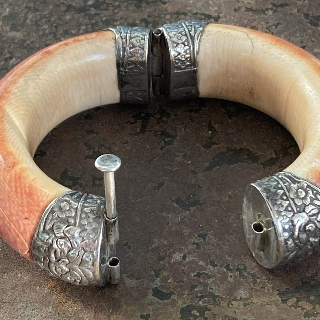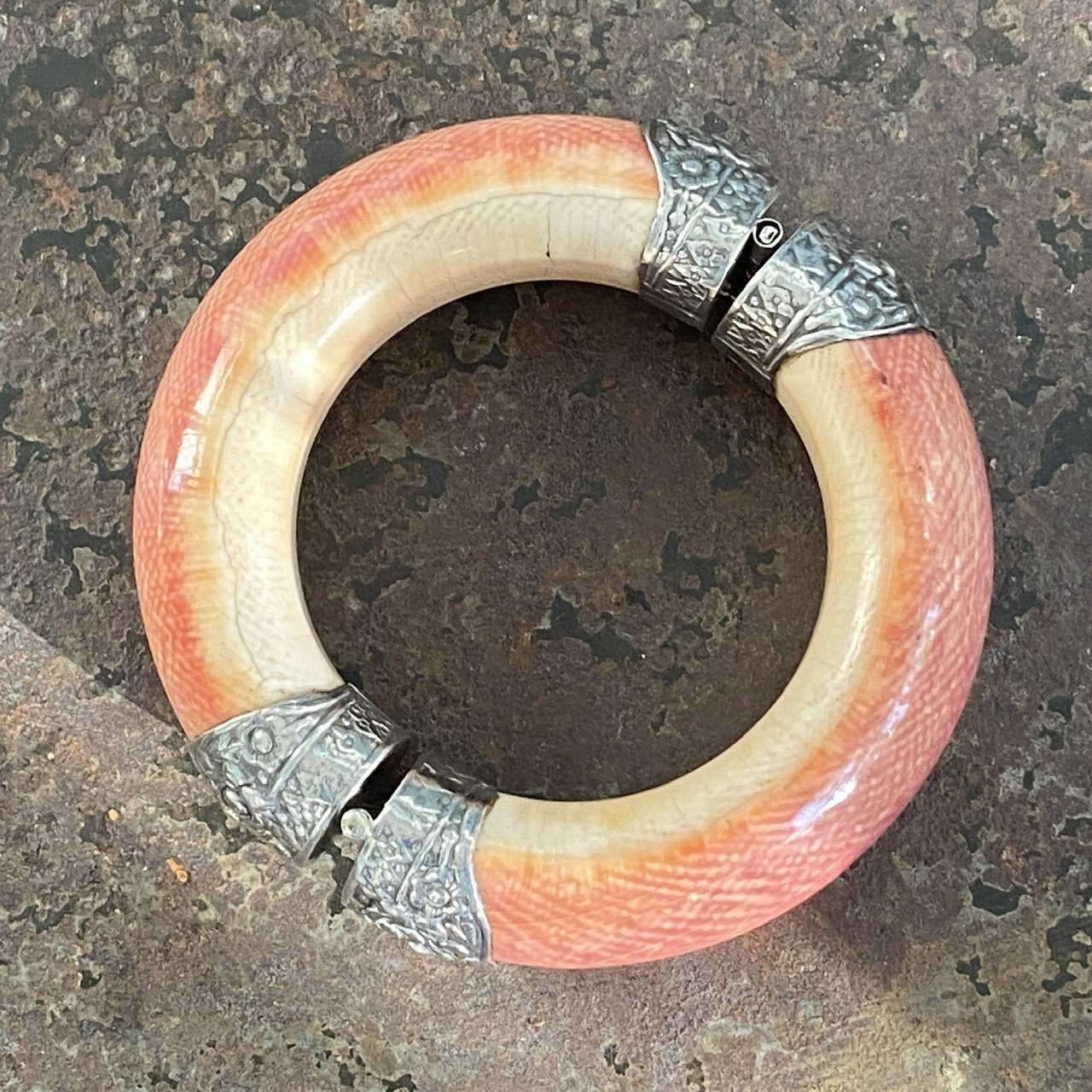 | Armringe S10a i sølv og ben formegentlig Indien. Ikke stemplet Diameter 9,5cm,indre dia 6,3.Tykkelsen er 2,7cm.Fin stand. Pris 1200kr. S10b er udført i sølvholdigt metal I Indien/Tibet og er ikke stemplet. Ydre diameter 10cm, indre 4,5cm. Tykkelse 2,6cm. Armringen er hul. fin stand. Pris 650kr. Emne nummer: S10 |