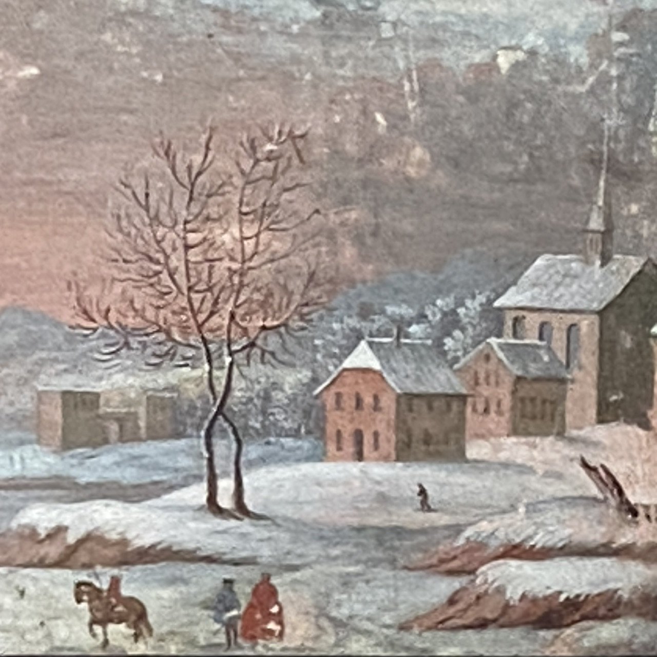 1700tals miniature maleri af ukendt kunstner malet på træplade i original ramme. Forestillende vinterlandskab med"borgfrue" på spadseretur i rød robe, fulgt af kavalerer. Fine detaljer.
