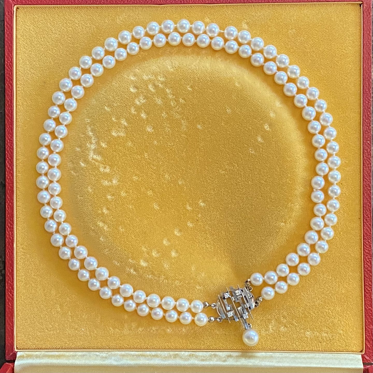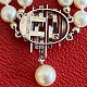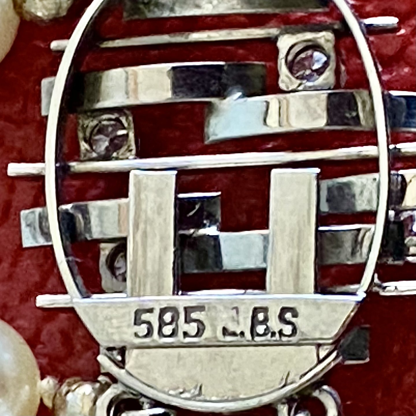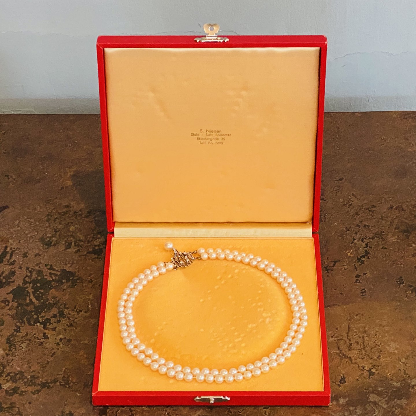 | Halskæde med 126 på Ø 6 mm. kulturperler i forløb. Større perle på vedhæng af 14k hvidguld med 4 små brillanter på hver 0,3k. Udført af J. Bjerring Sørensen mellem 1952-1980. Kæden ligger i original æske fra S. Nielsen Guld, Sølv & briliander. Skindergade 35. Pa. 3695 Emne nummer: S13 |
