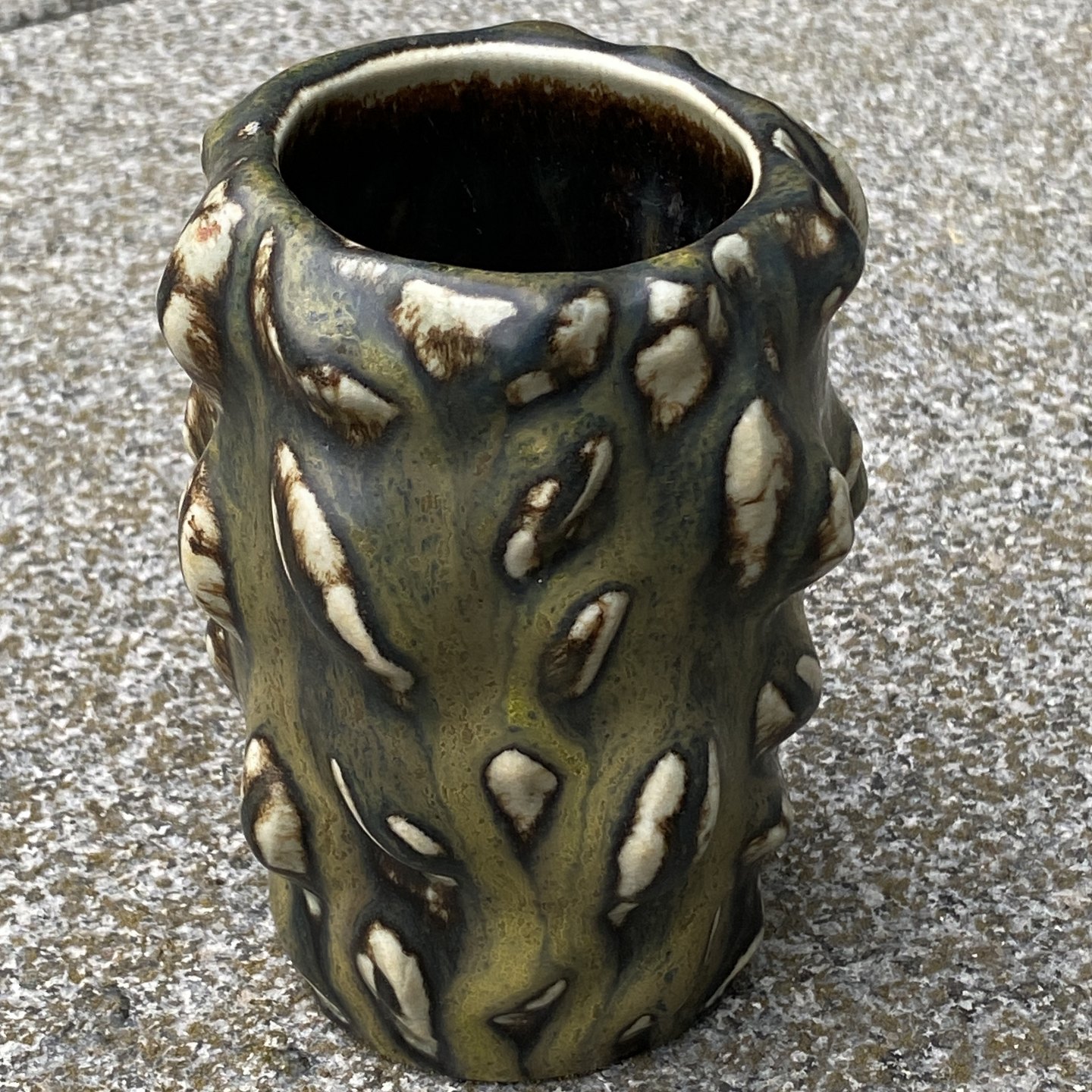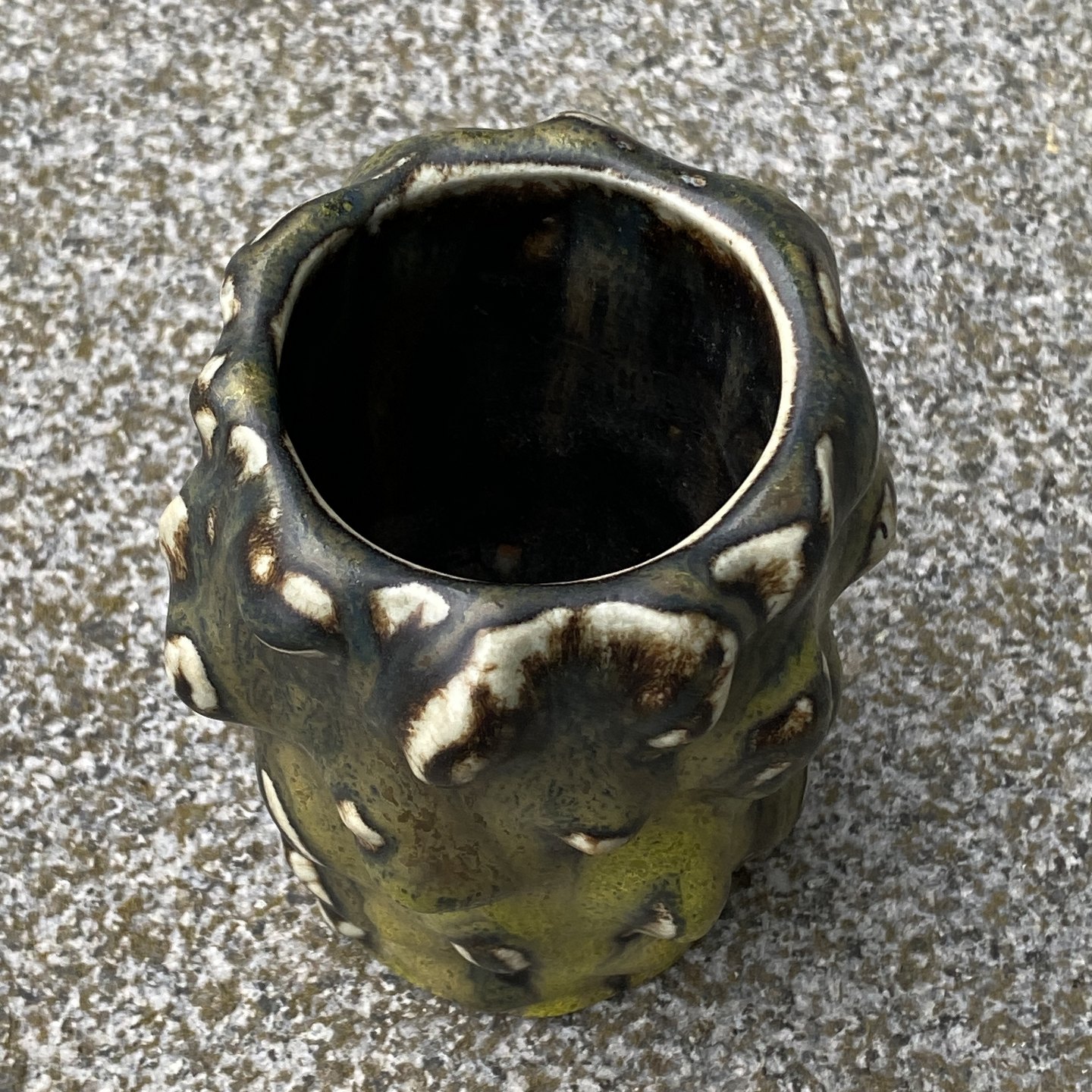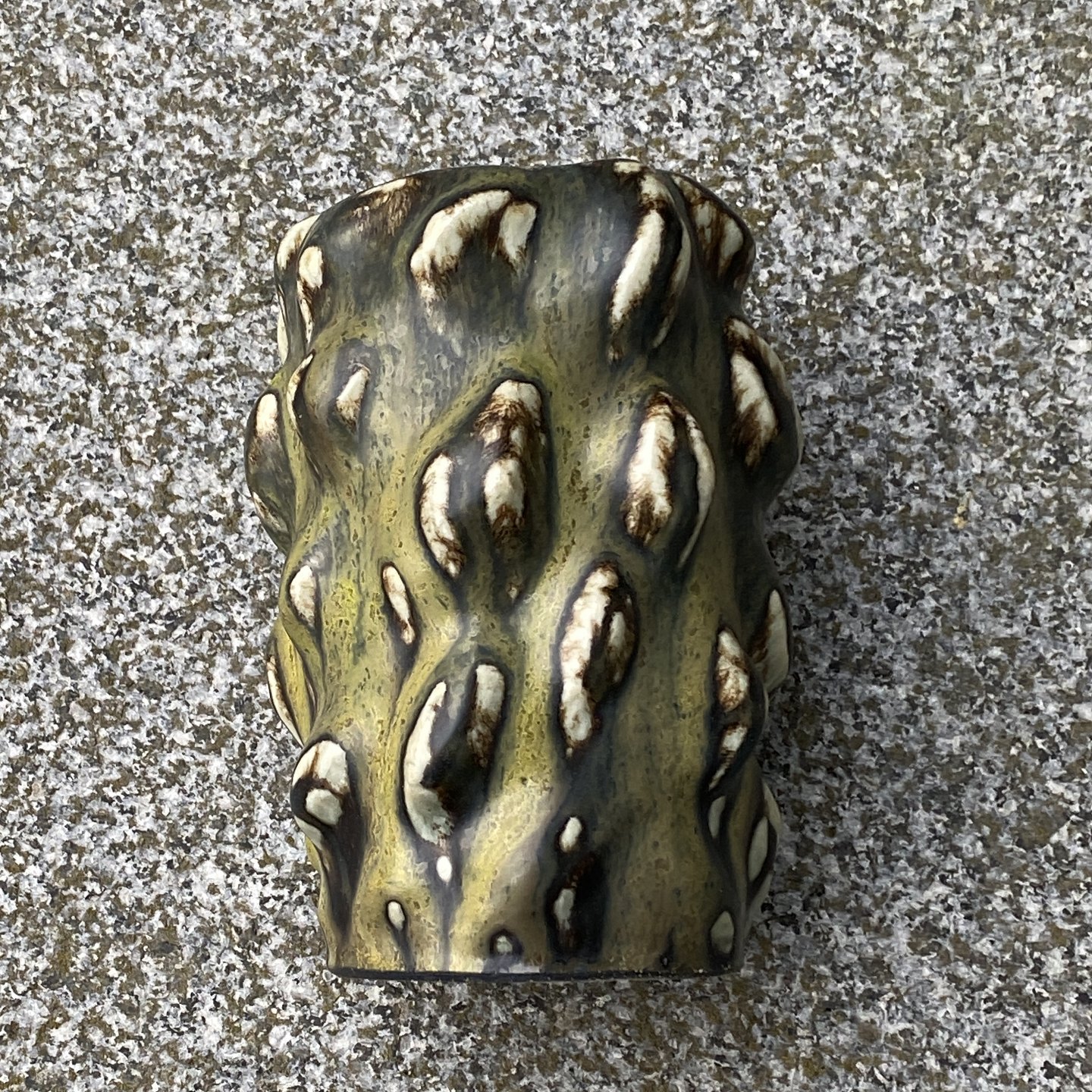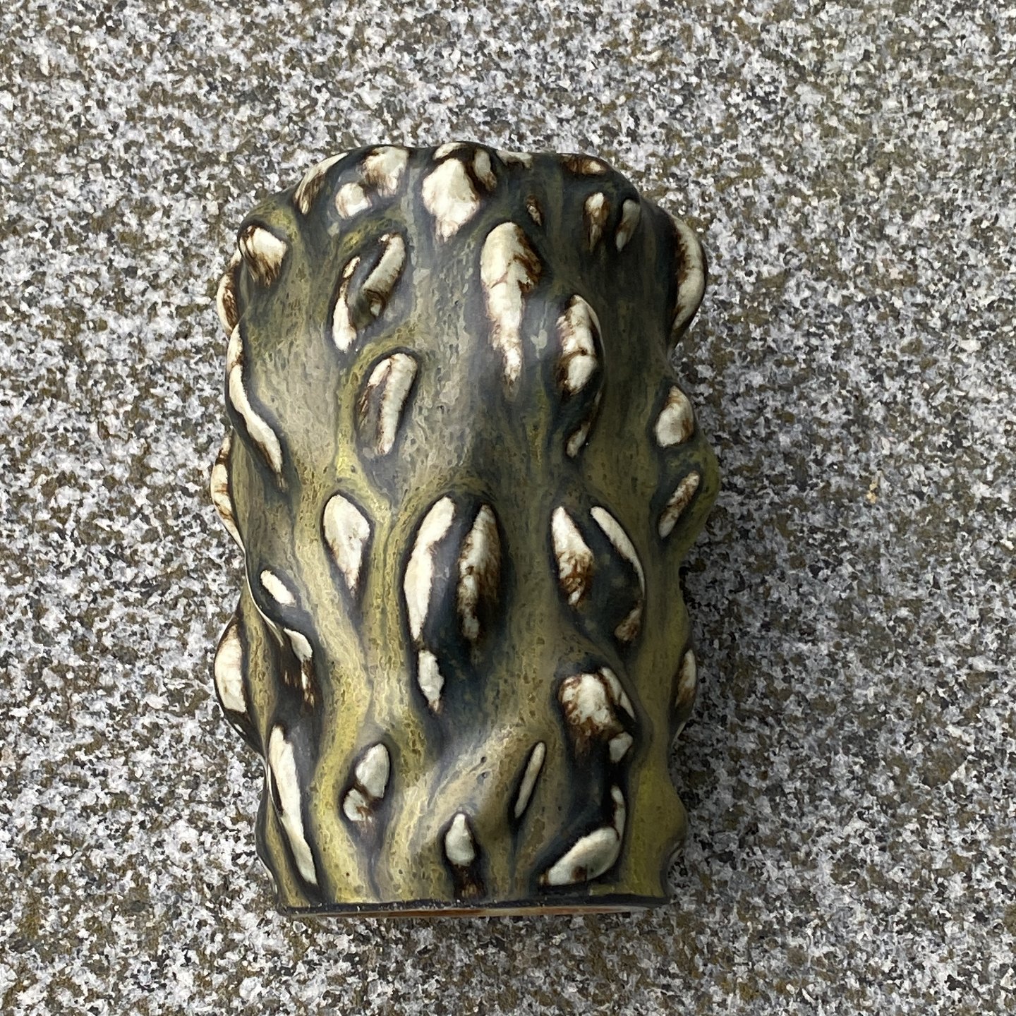 Royal Copenhagen stentøjsvase med smuk grønlig solfatara glasur i spirende stil.