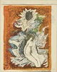 Kay Christensen litografi i farver. "Ung nøgen kvinde med en faunfigur bag sig".