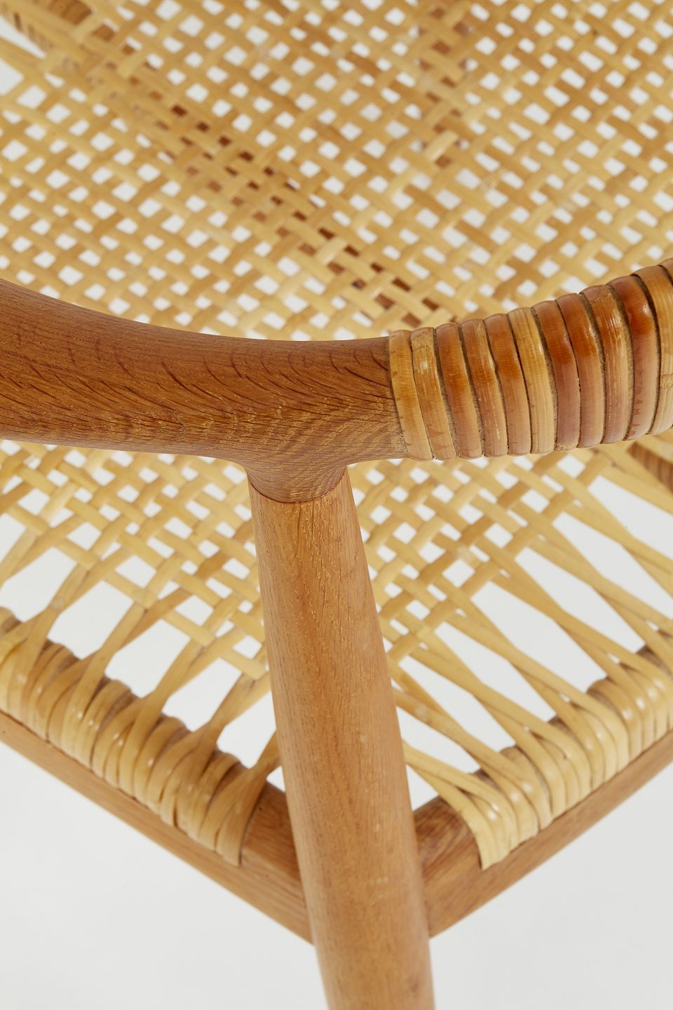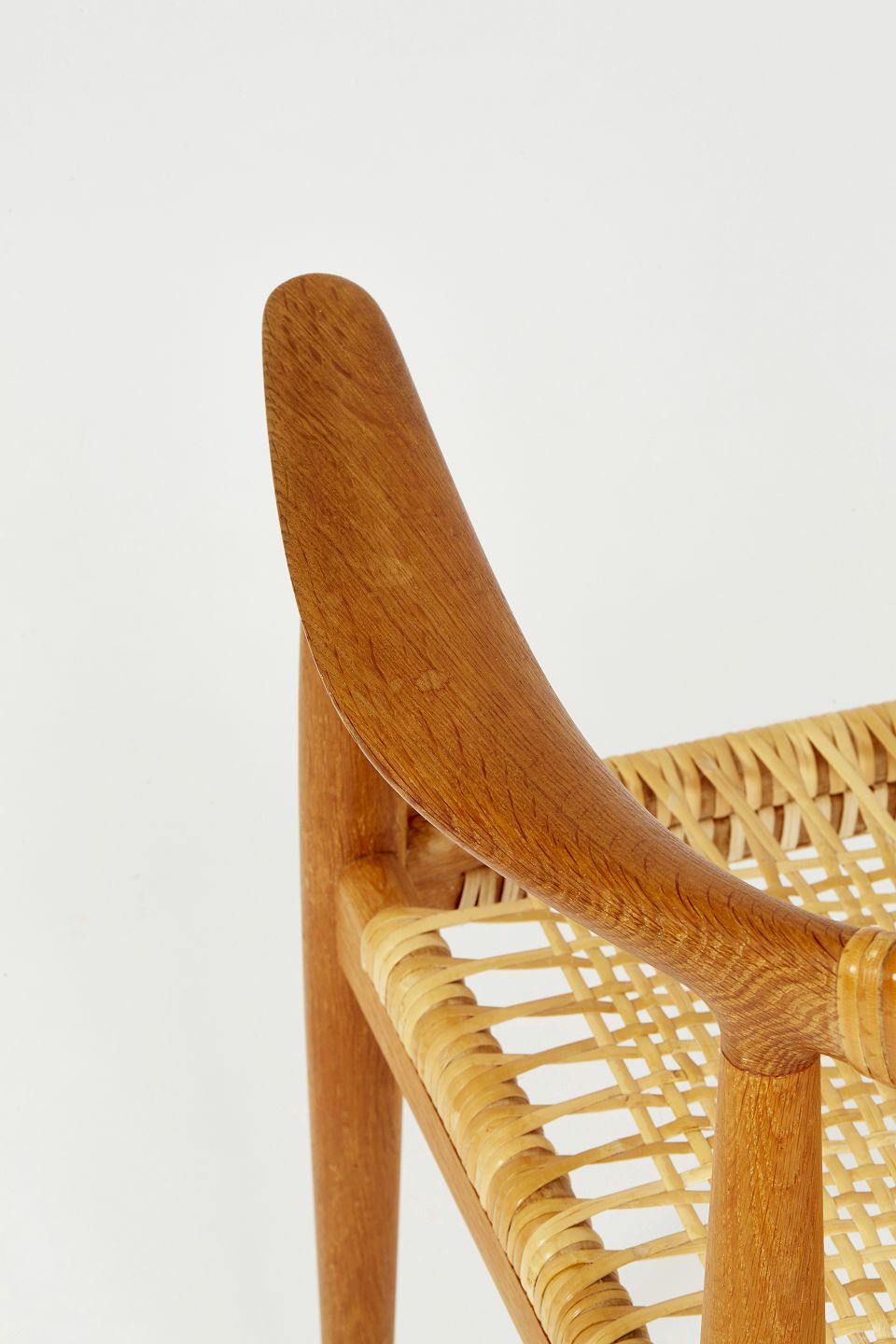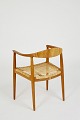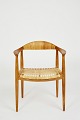 | Hans J. Wegner Armstol, model JH-501 'Den Runde Stol'/'The Chair'/‘kennedy stolen’ med stel af massiv egetræ. Sæde og ryg monteret med flet. Formgivet 1949 og fremstillet hos Johannes Hansen, brændstempel herfra. Stolen er en tidlig udgave. Stel og flet i fin stand. H. 77 cm. B. 63 cm. D. 52 cm. Sædehøjde 44 cm. Emne nummer: M103 |