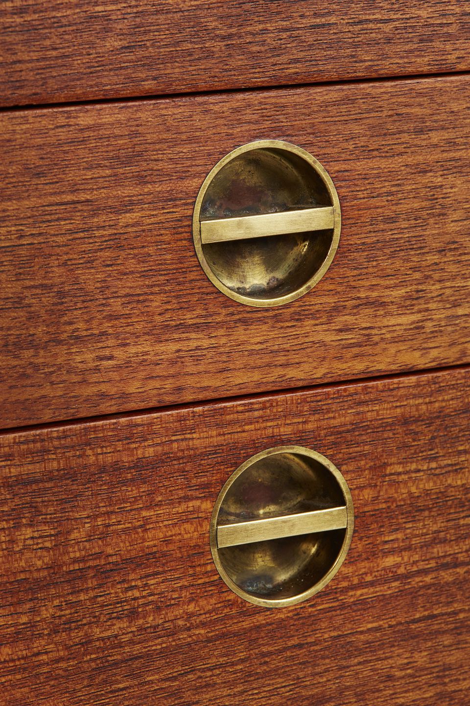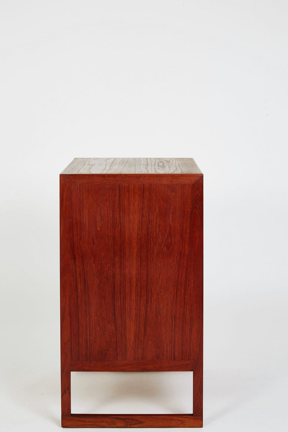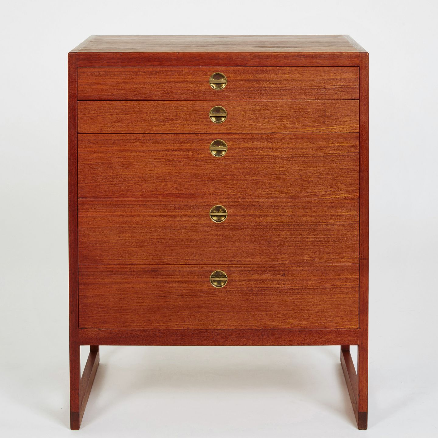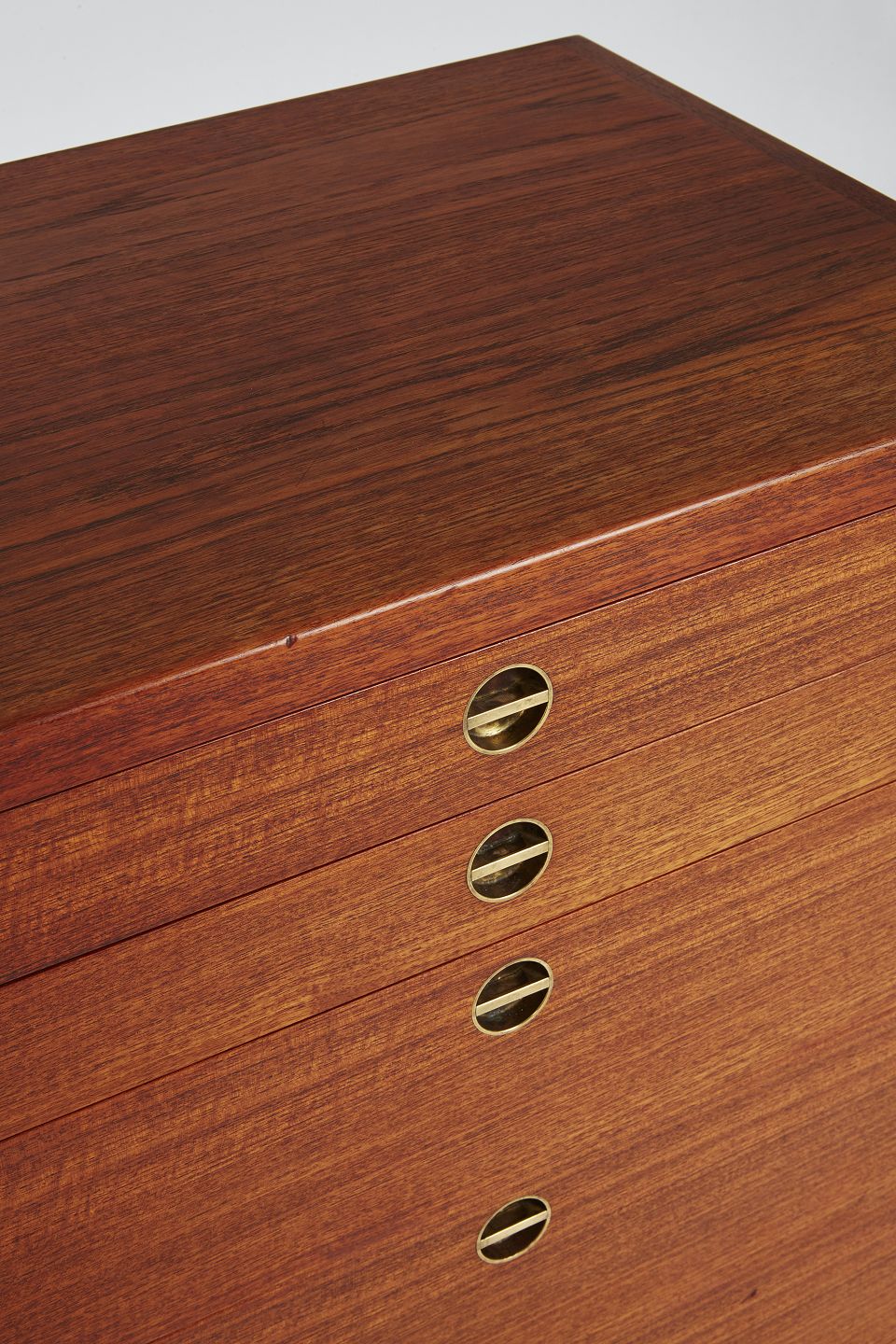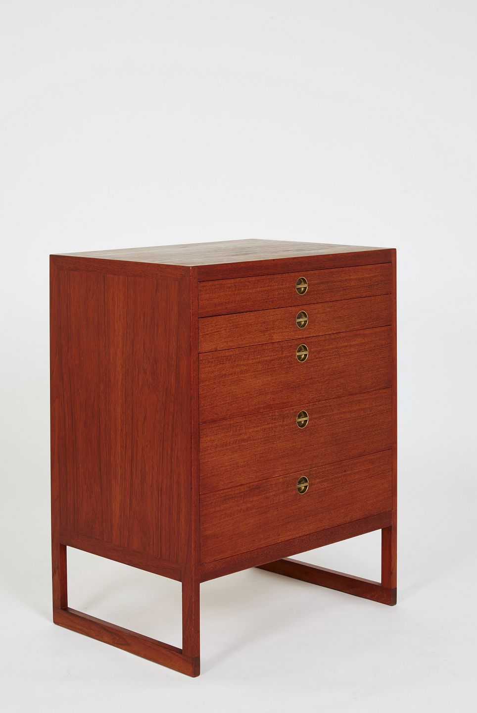 | Børge Mogensen. Kommode, model BM 57 af teaktræ på medeformede ben.Beslag af messing. Fremstillet hos P. Lauritsen & søn, Aalestrup. Litt: Mobilia 1957. H. 90 cm. B. 70 cm. D. 50 cm. God original patineret stand. Mindre trykmærke på fronten. Emne nummer: M111 |