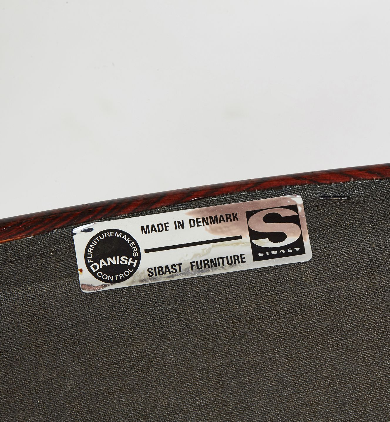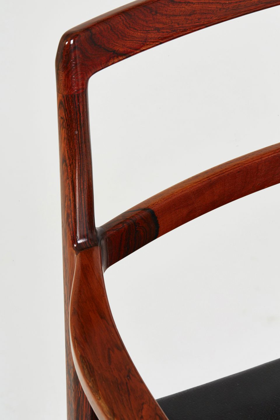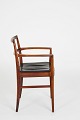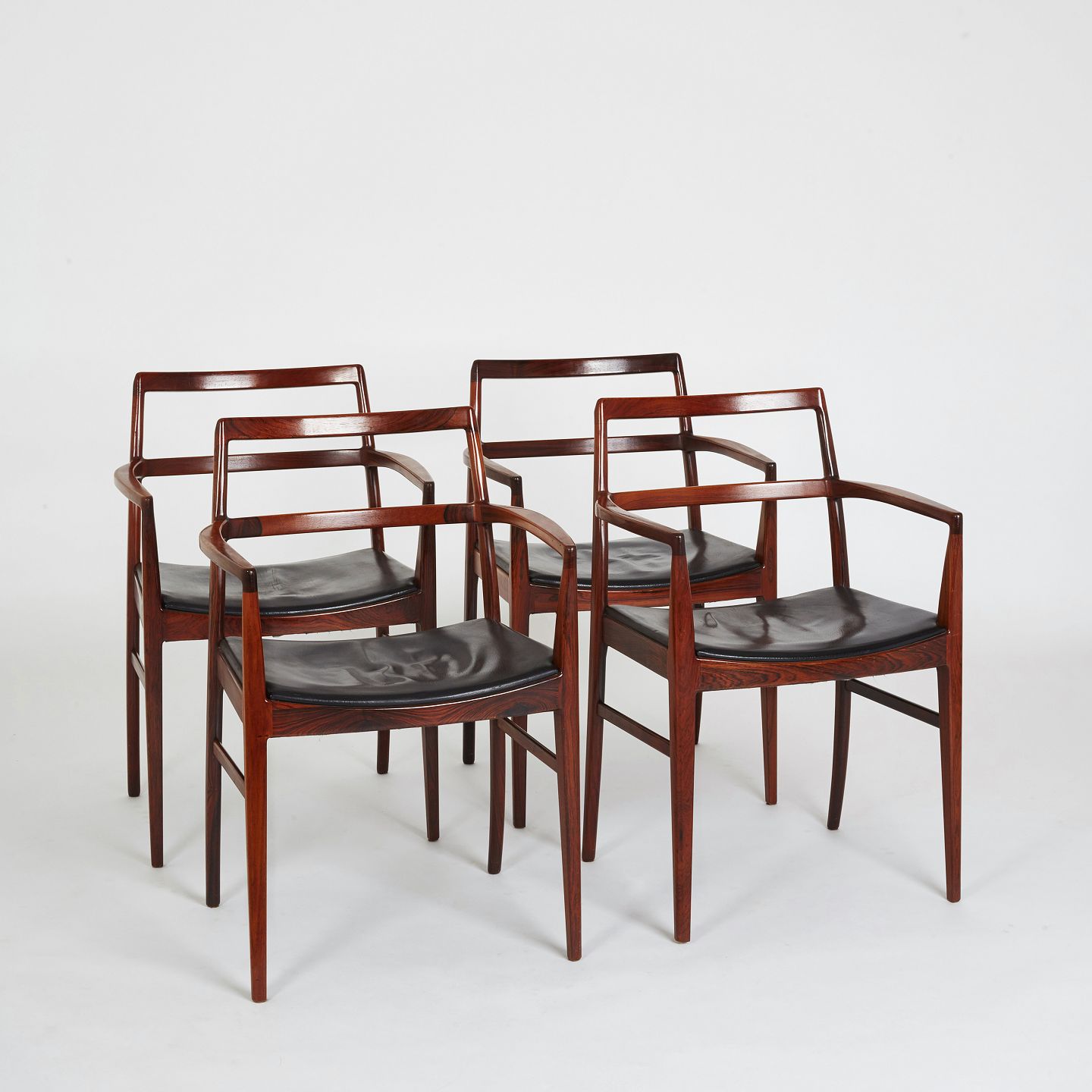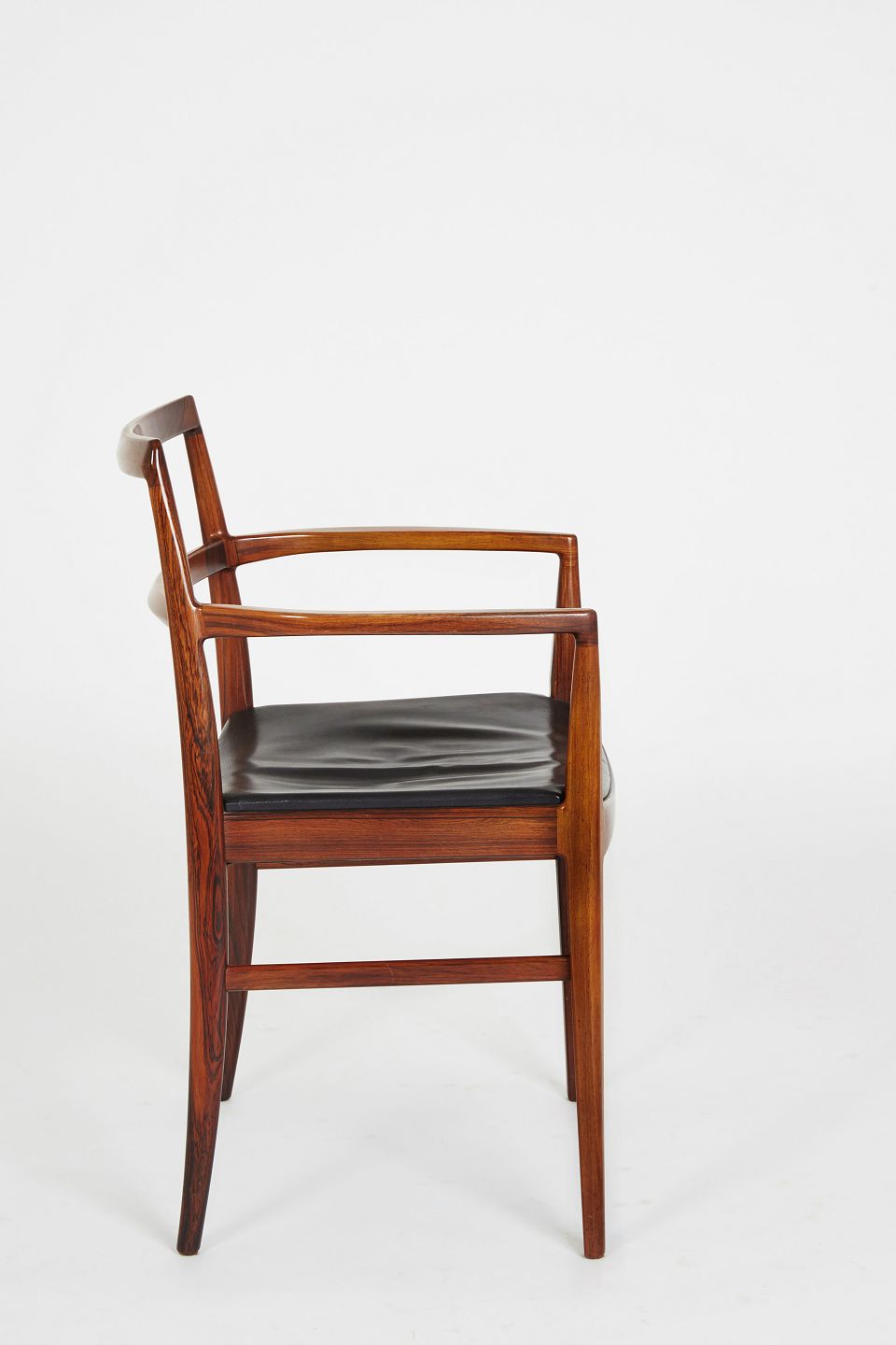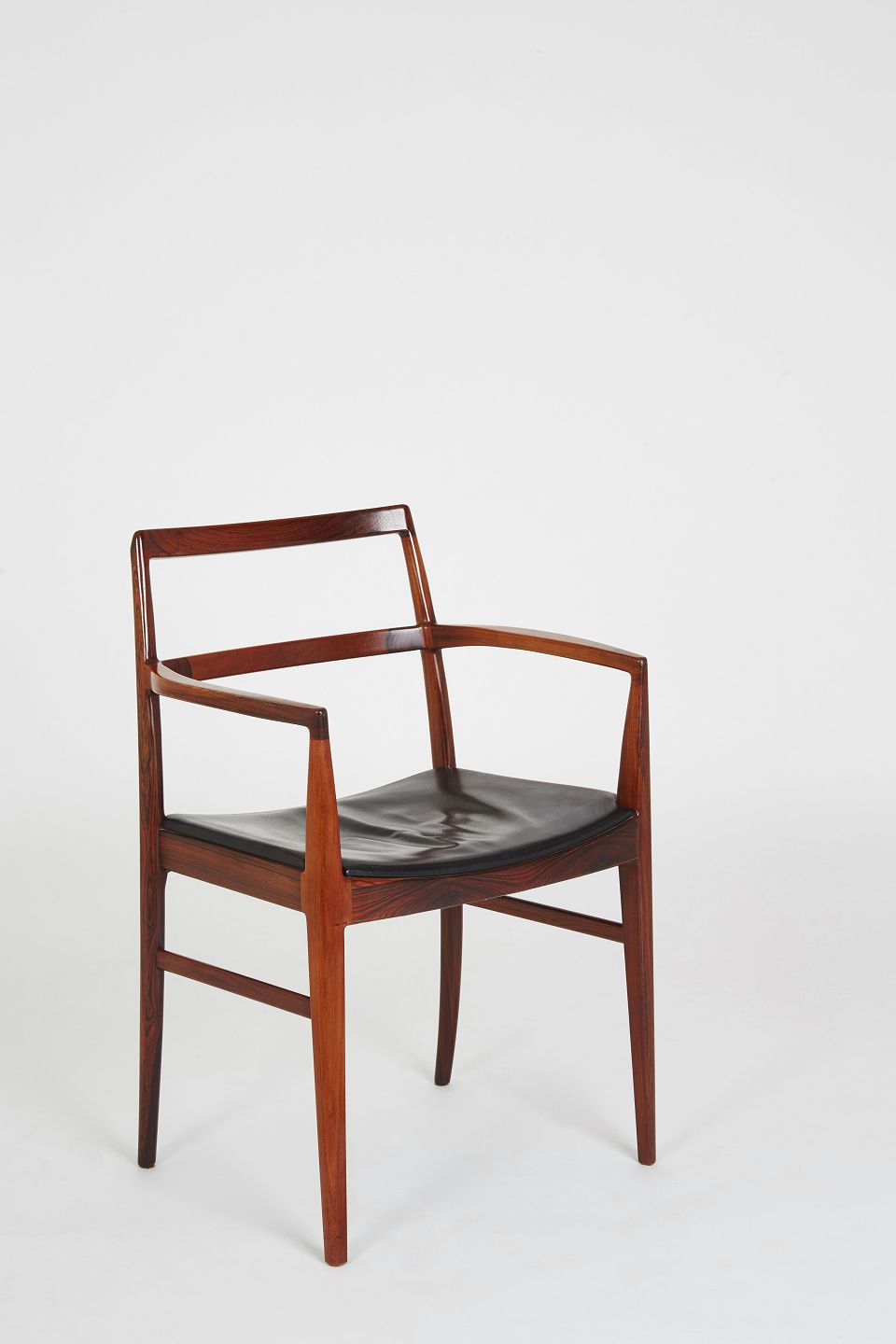 | Armstole af palisander tegnet af Arne Vodder. Sæde betrukket med originalt sort skind. Stolene er mærket med Sibast Furniture samt logo. Fin original stand. 2 stole tlbage. H. 81 cm. D. 48,5 cm. B. 56,5 cm. Sædehøjde 45 cm. Armlæn højde 65 cm. Emne nummer: M114 |