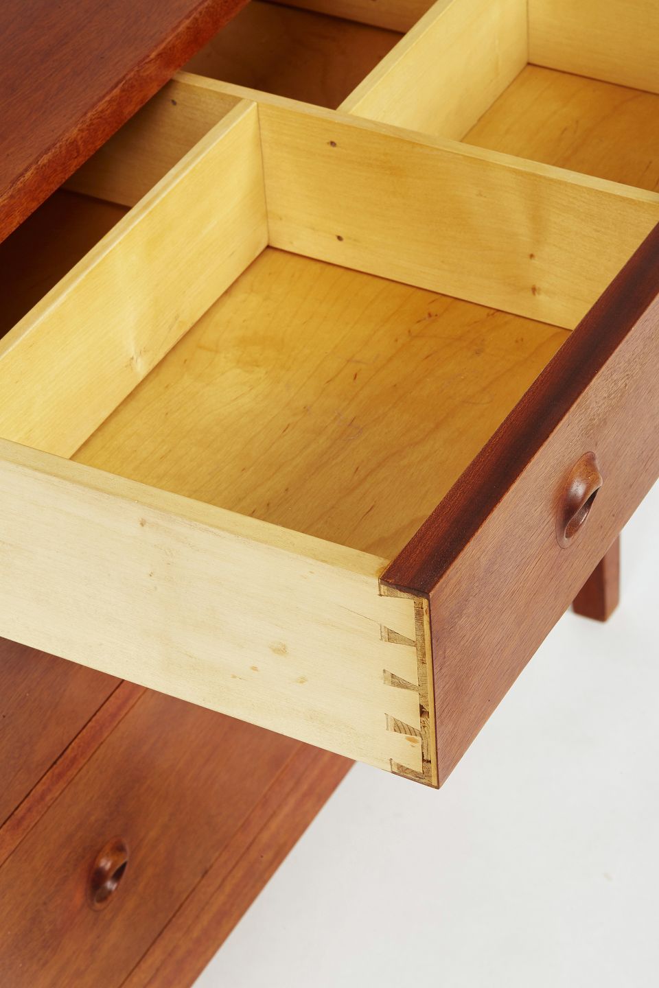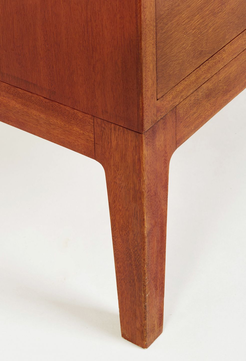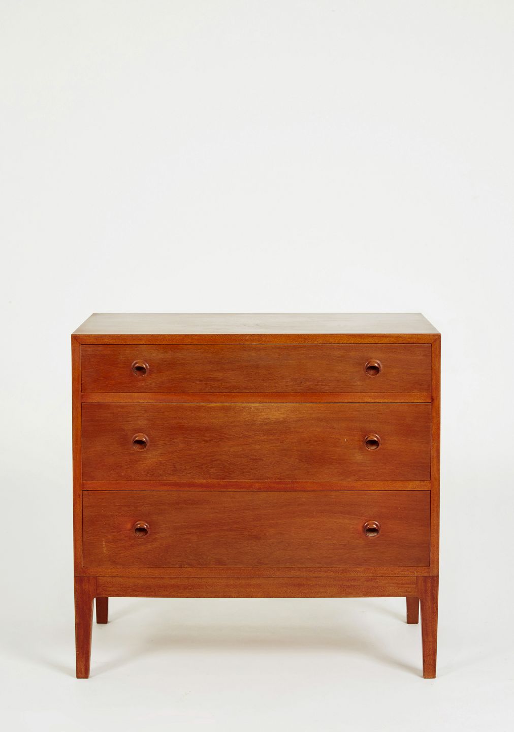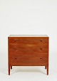 | Helge Vestergaard Jensen kommode af mahogni med tre skuffer. Kommoden er stående på tilspidsede ben. Formgivet i 1950’erne og udført hos Søren Horn H. 72 cm. B. 75 cm. D. 44 cm. Emne nummer: M119 |