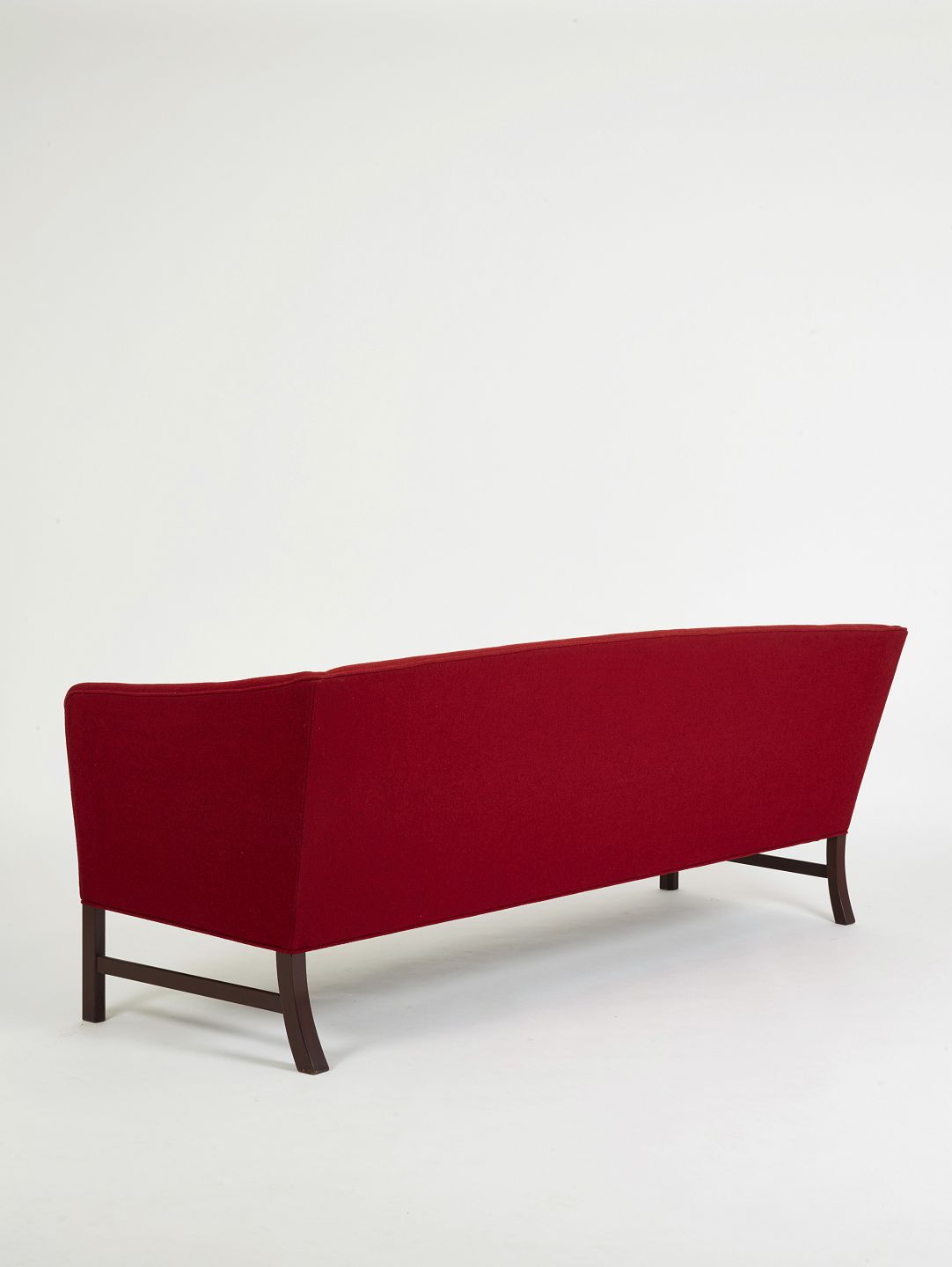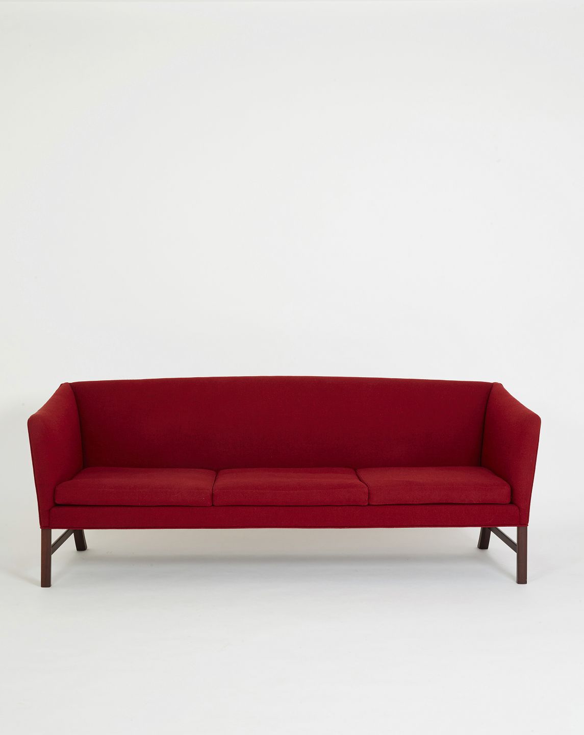 Ole Wanscher 3-personers sofa udført hos P.E.Jeppesen i rød uld og mahogni ben.Løse hynder med dunfyld. Fin brugt stand.