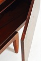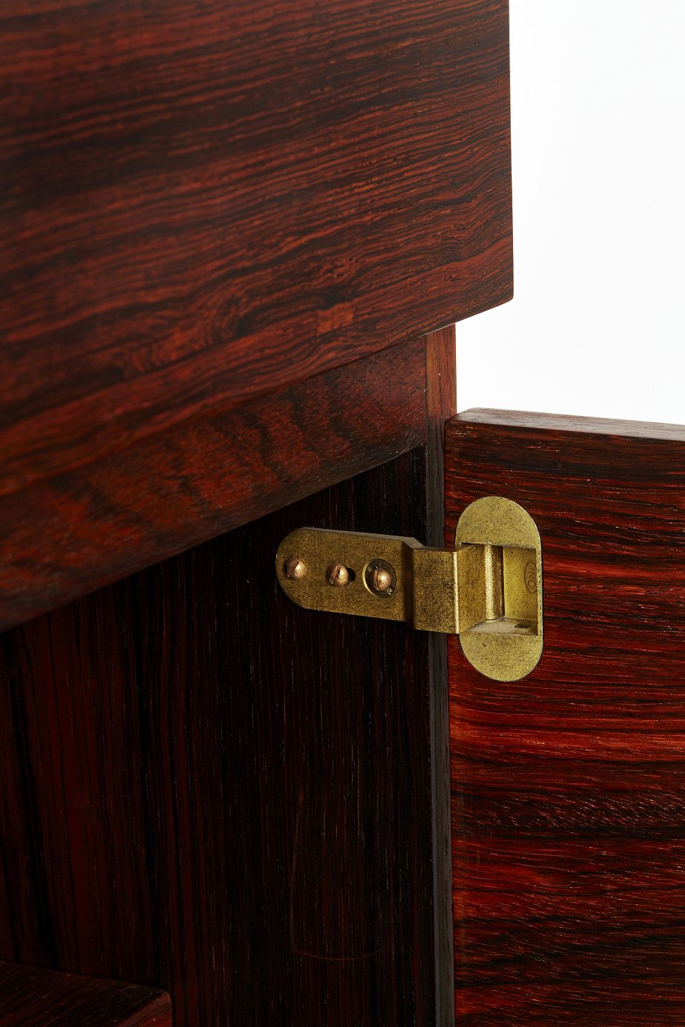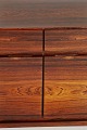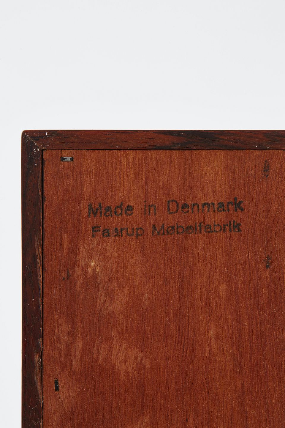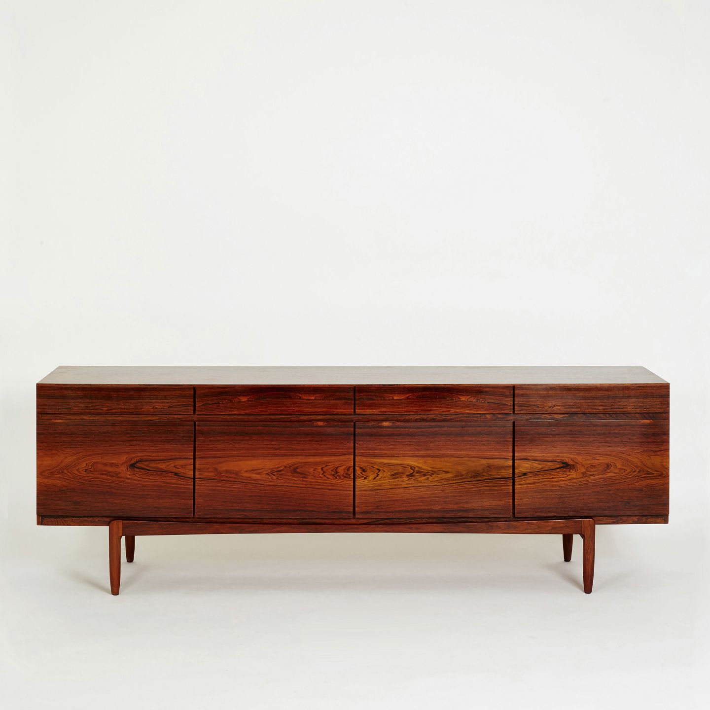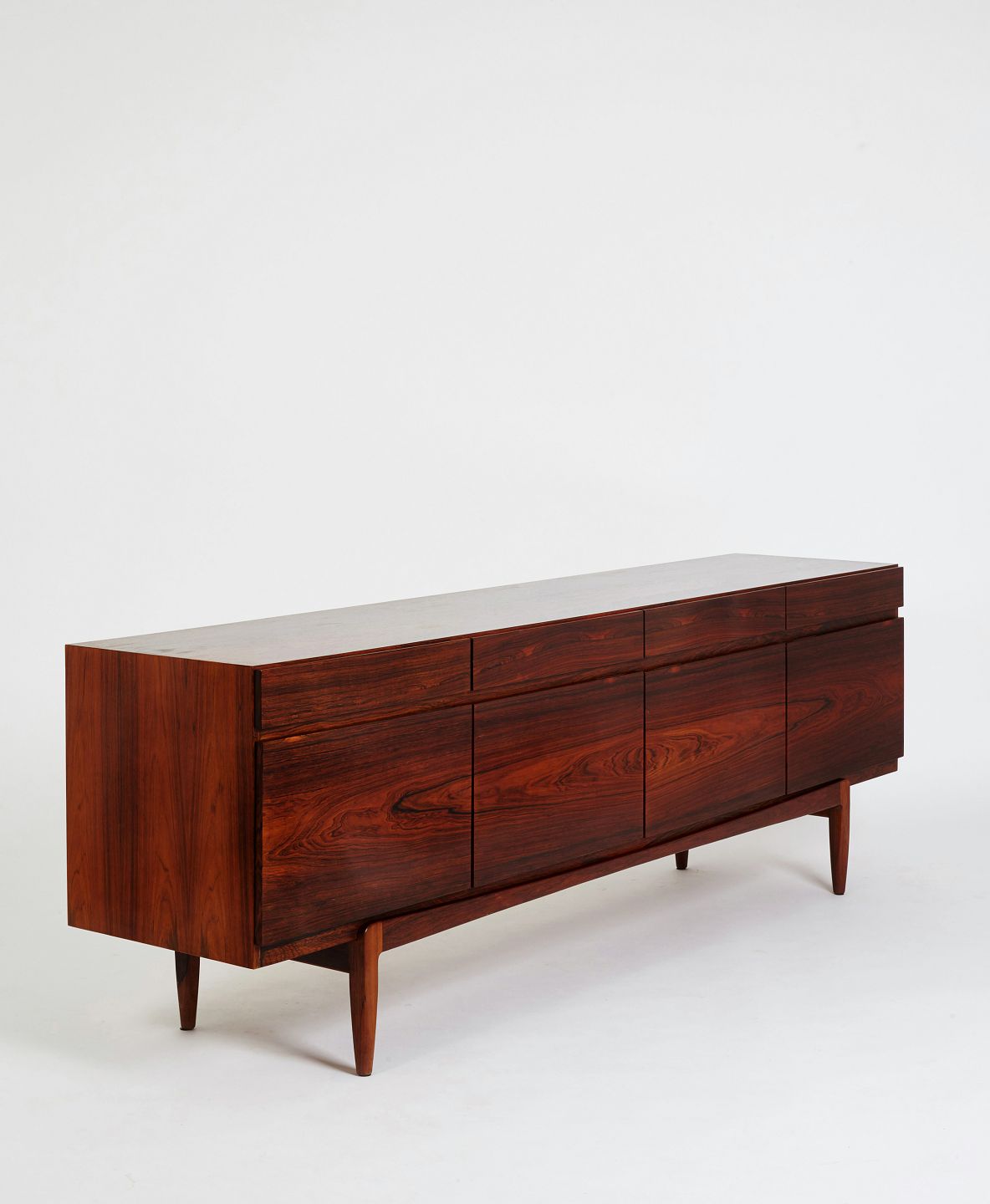 | Ib Kofod-Larsen. Lav fritstående skænk af Palisander. Front med fire låger samt fire skuffer. Skænken er udført med spejlskåret finér. Bag lågerne er der udtræksbakker og hylder. Fremstillet hos Faarup Møbelfabrik, model FA-66. Tidlig model. Fin original stand. B. 230 cm. H. 77 cm D. 50 cm. (vi har også en nyere model af denne skænk i palisander på lager til en lavere pris) Emne nummer: M130 |