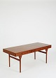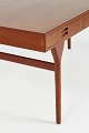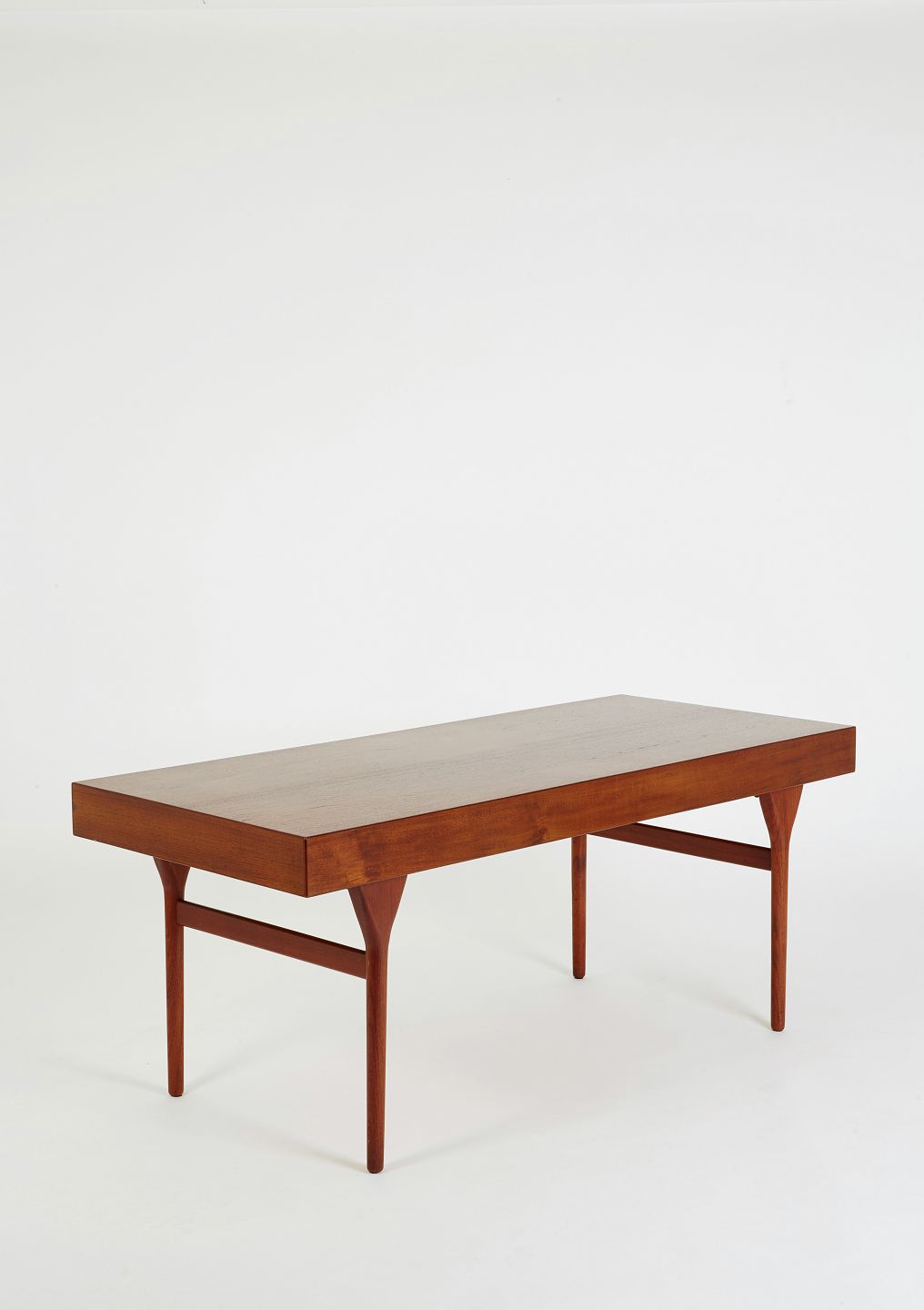| Nanna Ditzel. Fritstående kasetteformet skrivebord af teaktræ, sarg med fire integrerede skuffer, på runde kegleformede ben. Formgivet i 1958. Fremstillet hos Søren Willadsen, Vejen. Fin restaureret stand. H. 72 cm. B. 175,5 cm. D. 75,5 cm. Emne nummer: M144 |
