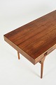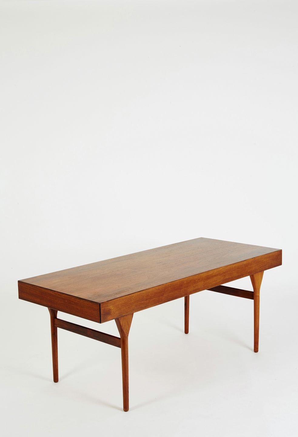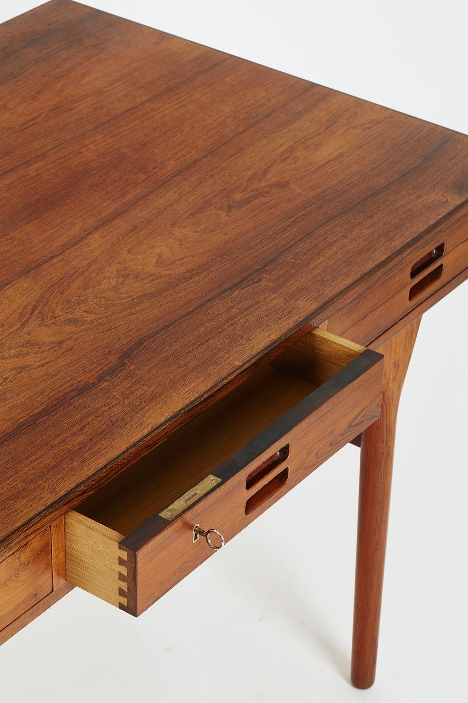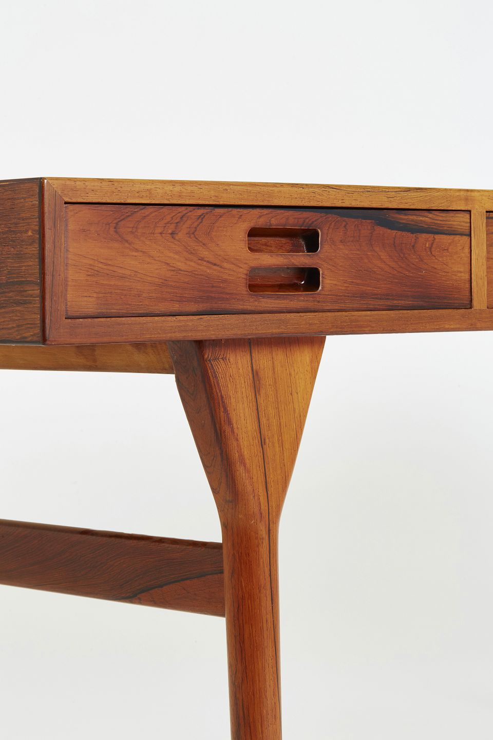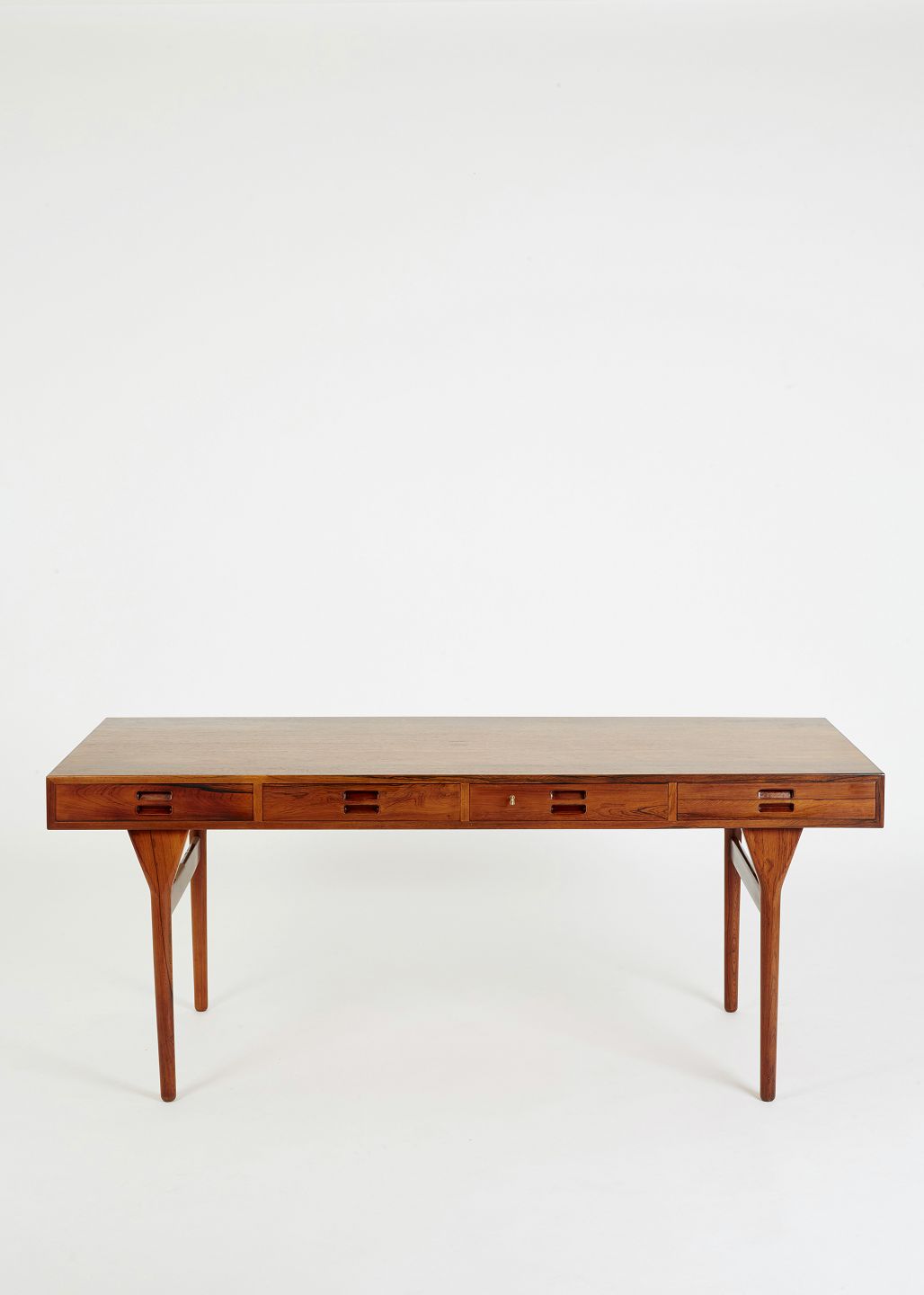 | Nanna Ditzel. Fritstående kasetteformet skrivebord af palisander, sarg med fire integrerede skuffer, på runde kegleformede ben. Formgivet i 1958. Fremstillet hos Søren Willadsen, Vejen. Fremstår i smukt renoveret stand. H. 72 cm. B. 175,5 cm. D. 75,5 cm. Emne nummer: M145 |