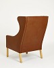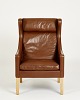 | Børge Mogensen øreklapstol model 2204. Øreklapstol med ben af lyst egetræ.Hynder med dunfyld og med originalt betræk i brunt læder. Velholdt stand med brugsspor. H. 107 cm. B. 77 cm. D. 88 cm. Sædehøjde 45 cm. Fremstillet hos Fredericia Stolefabrik. Mærket i bunden. Emne nummer: M142 |