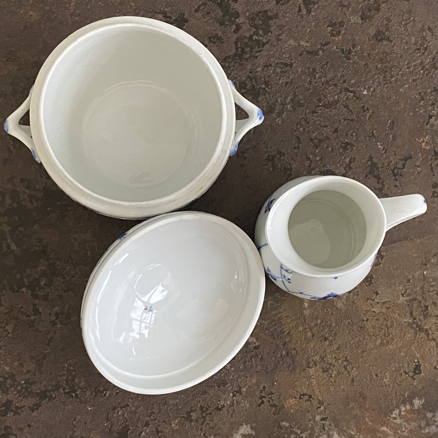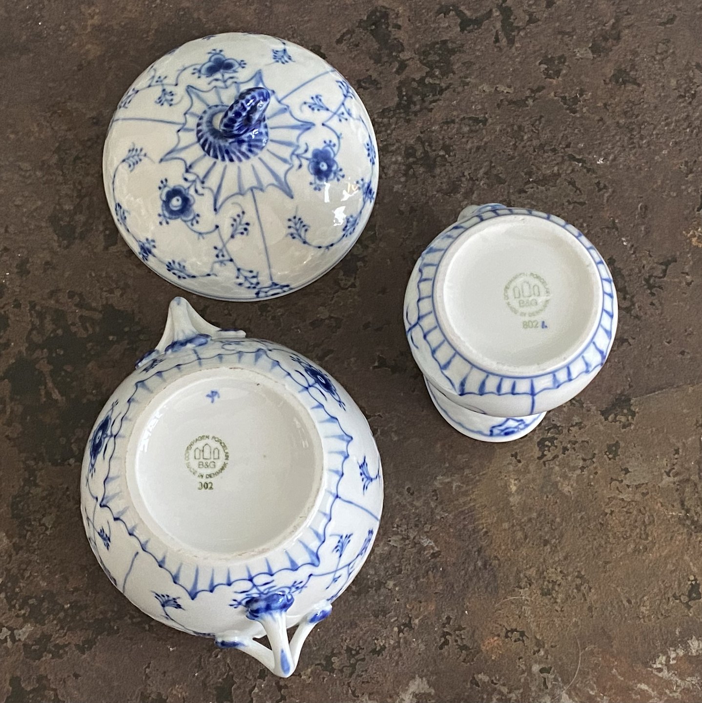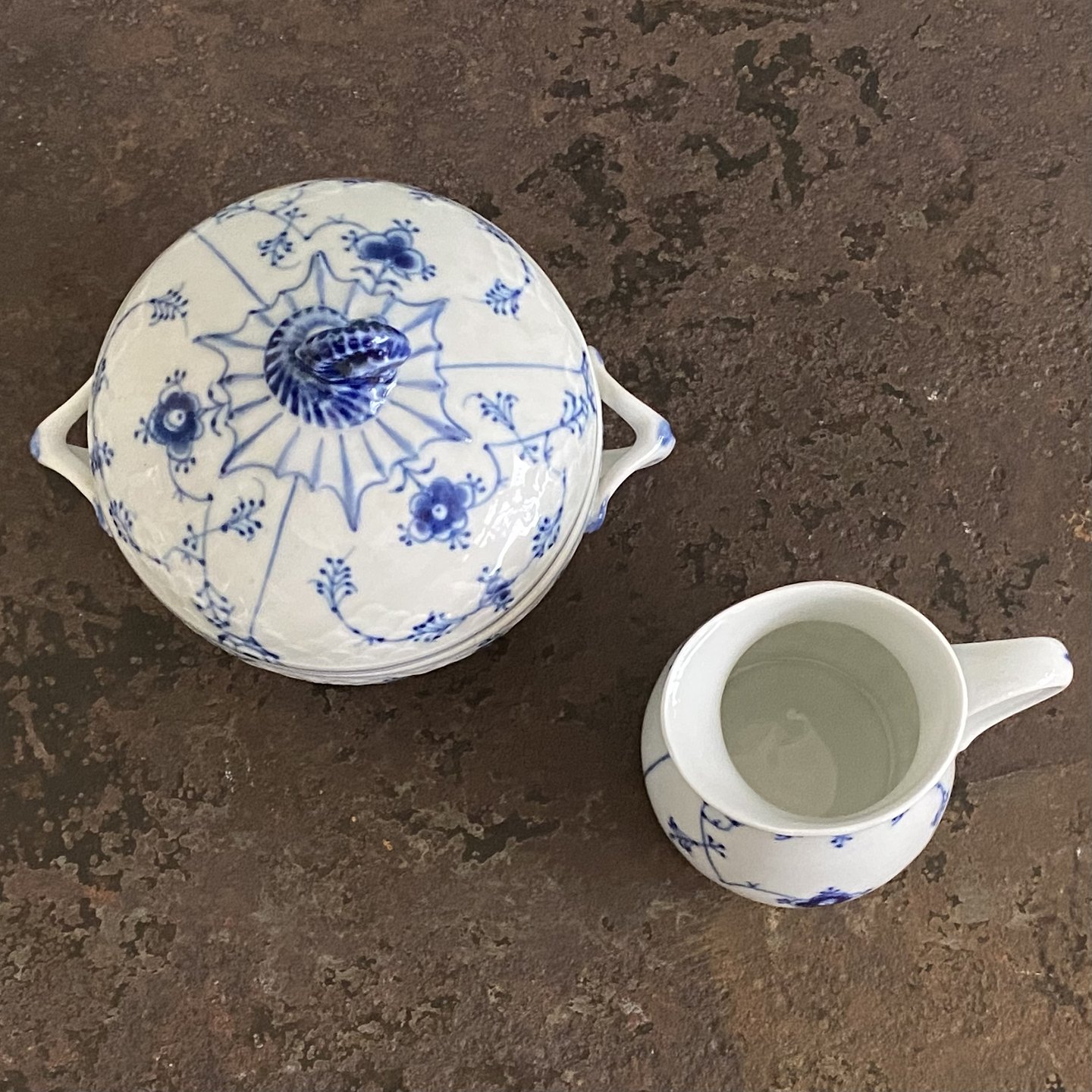 Musselmalet Sukkerskål nr 302 (Stor model H. 12 cm) & Flødekande (3sort) nr 802.
