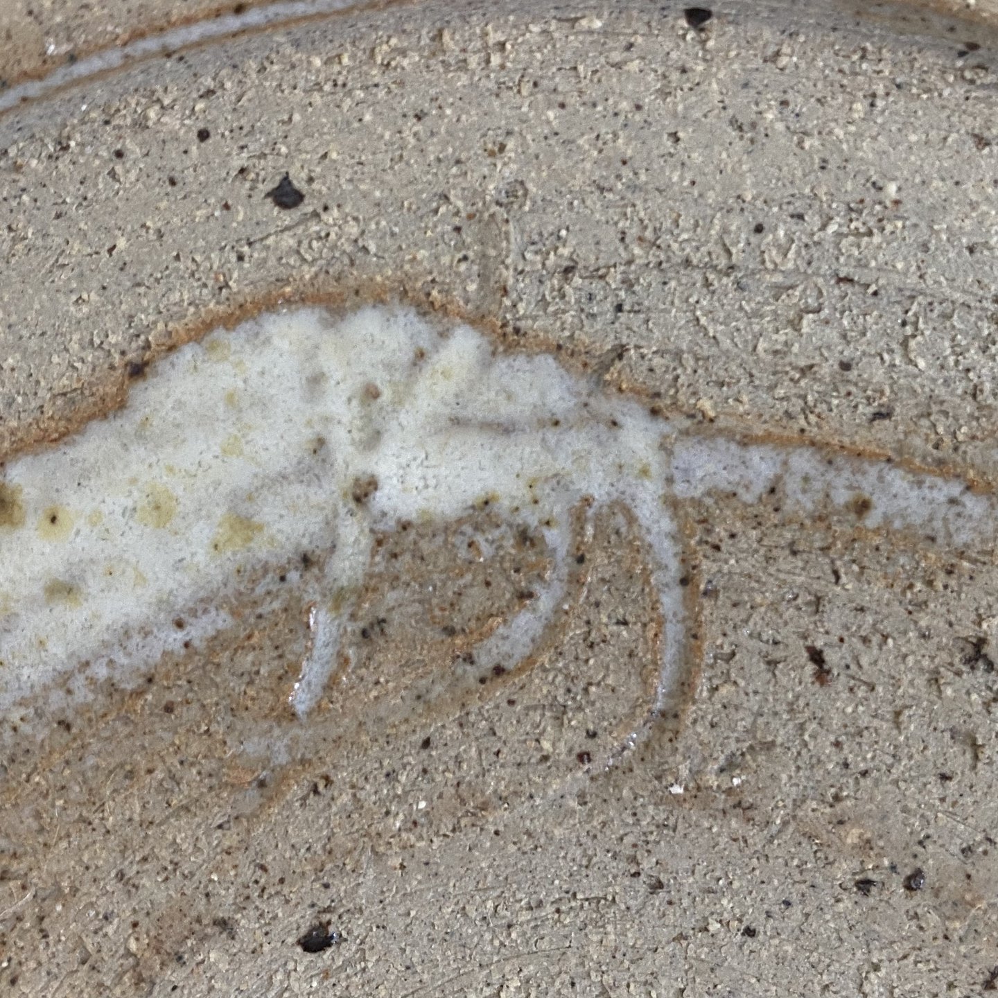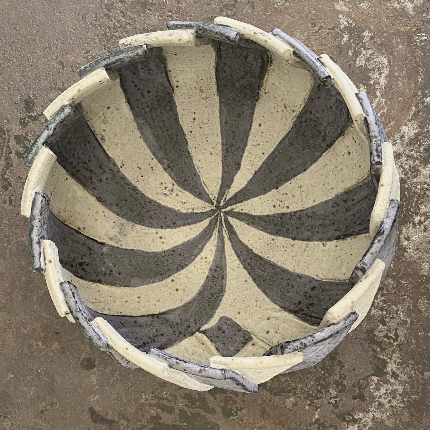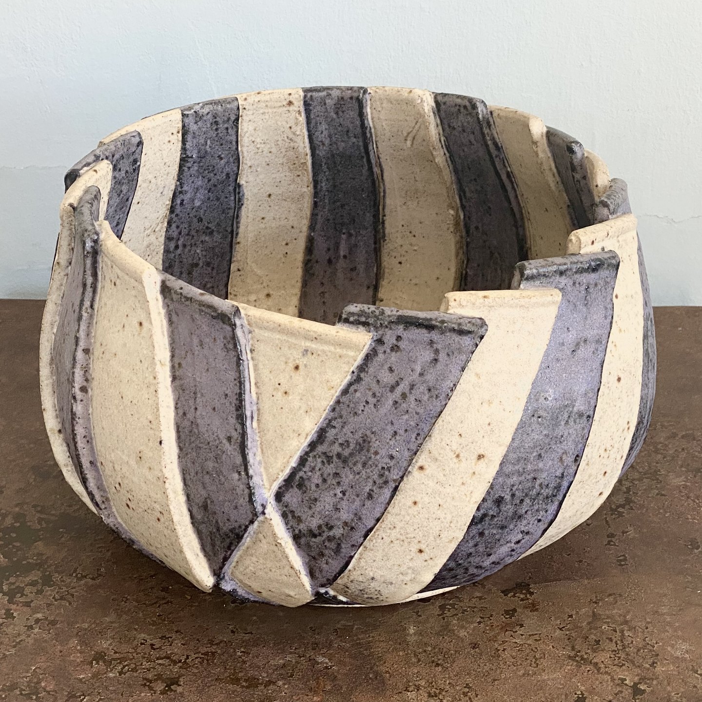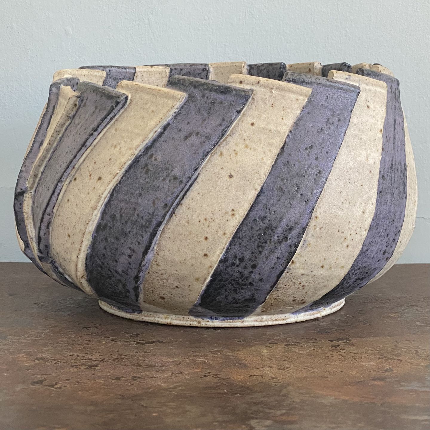 Stor Skål af stentøj med hvid og lilla glasur "flettet" i forløb.