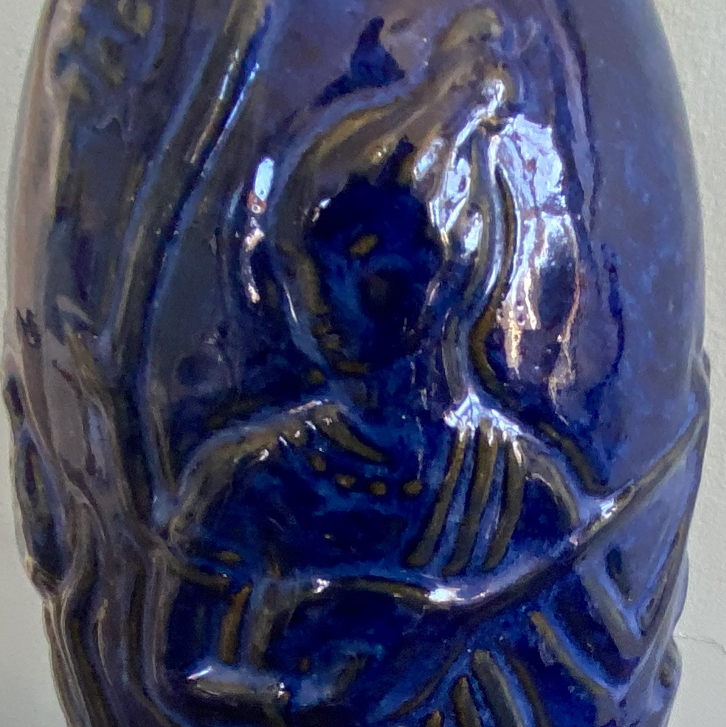 L. Hjorth lampefod af blåglaseret keramik dekoreret med figurer i relief. Perfekt stand.