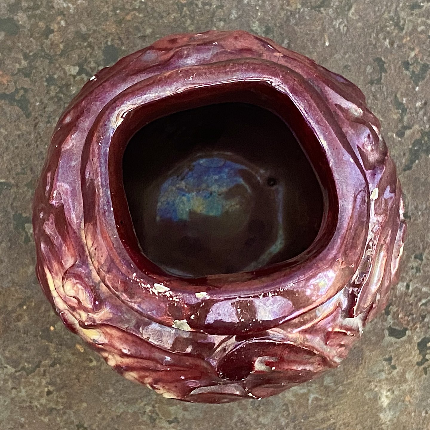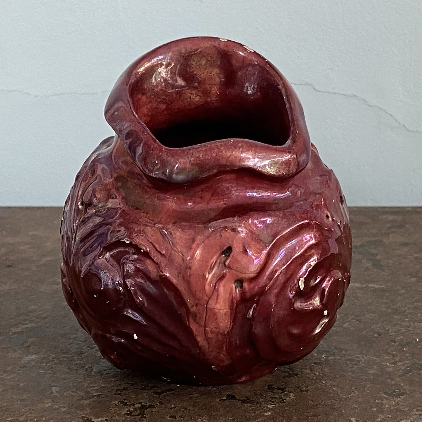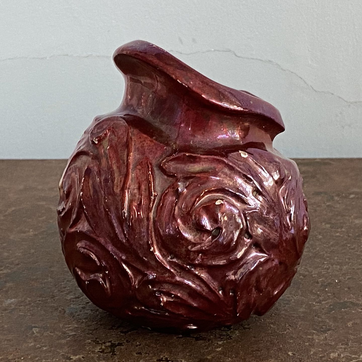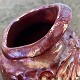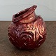 | Lille vase forgivet af Svend Hammershøi i 1913 med Jens Thirslunds røde lustreglasur. Vasen er asymmetrisk med bladværk i relief. Fremstår med små chip/afslag på mundranden og bundkanten. H. 11,5 cm. Ø 9,3 cm. Emne nummer: K130 |