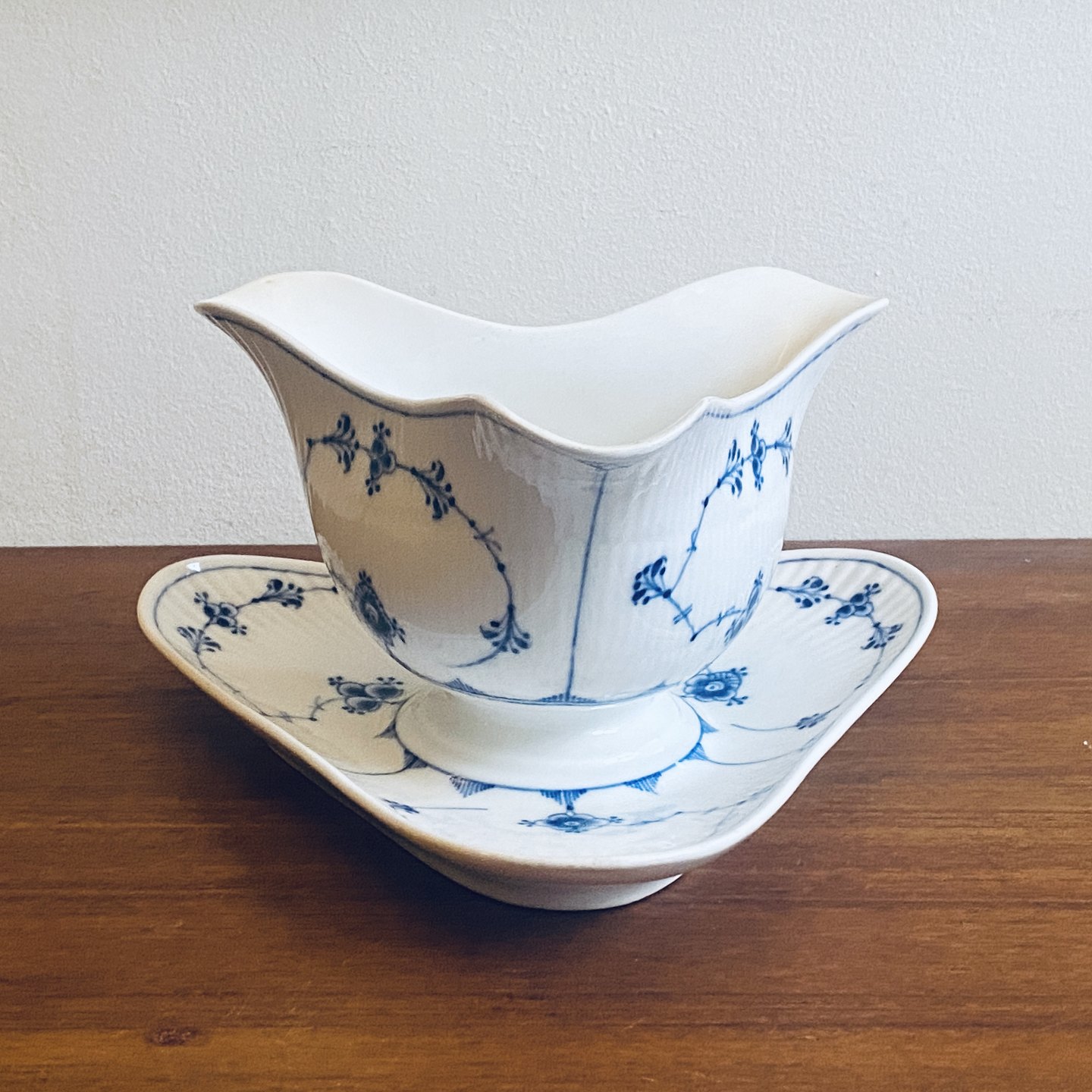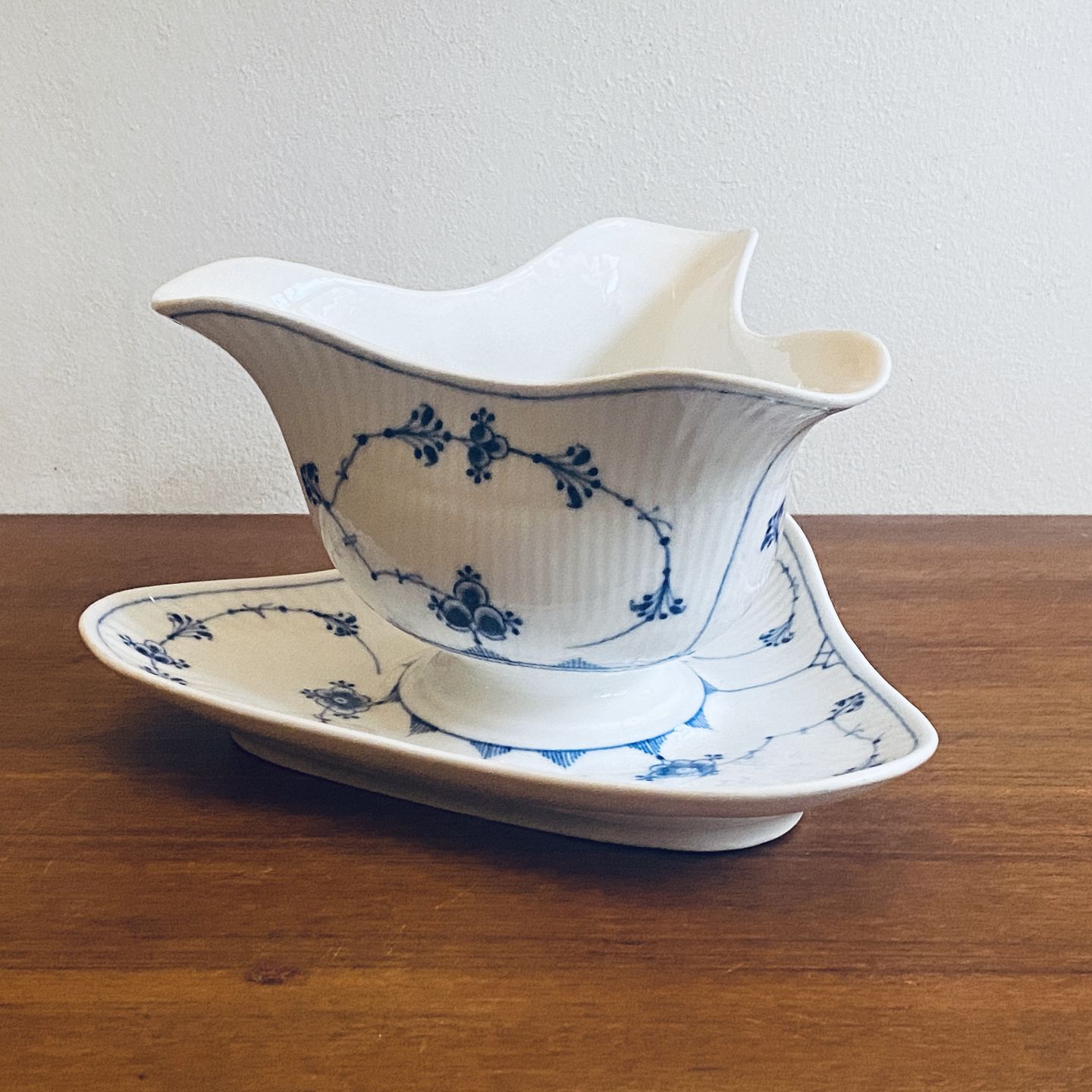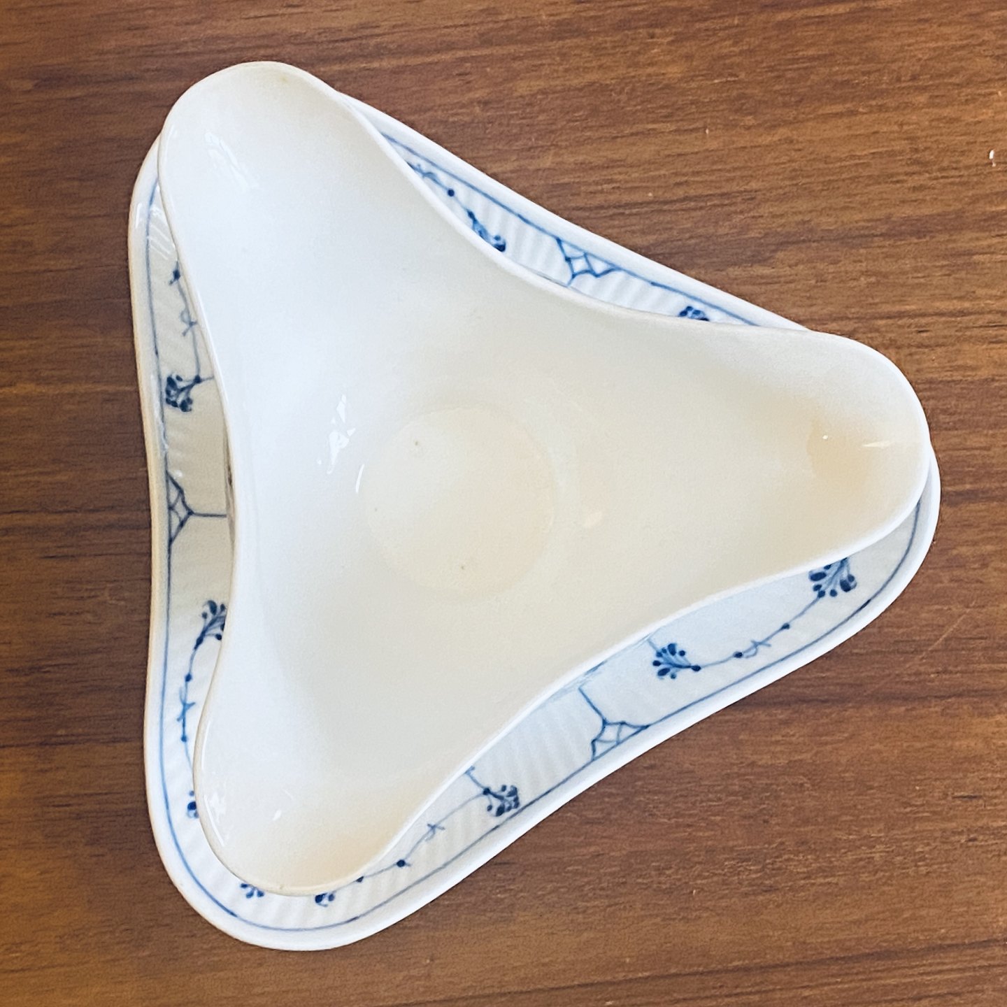 Musselmalet Riflet, trekantet sauceskål. Denne er produceret fra 1898-1923 og er sjælden udbudt til salg.