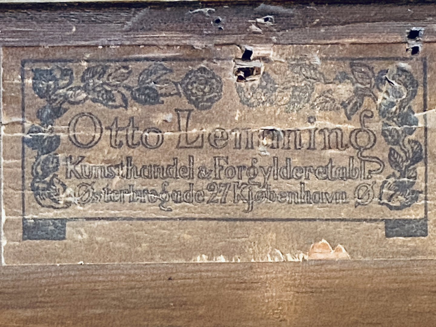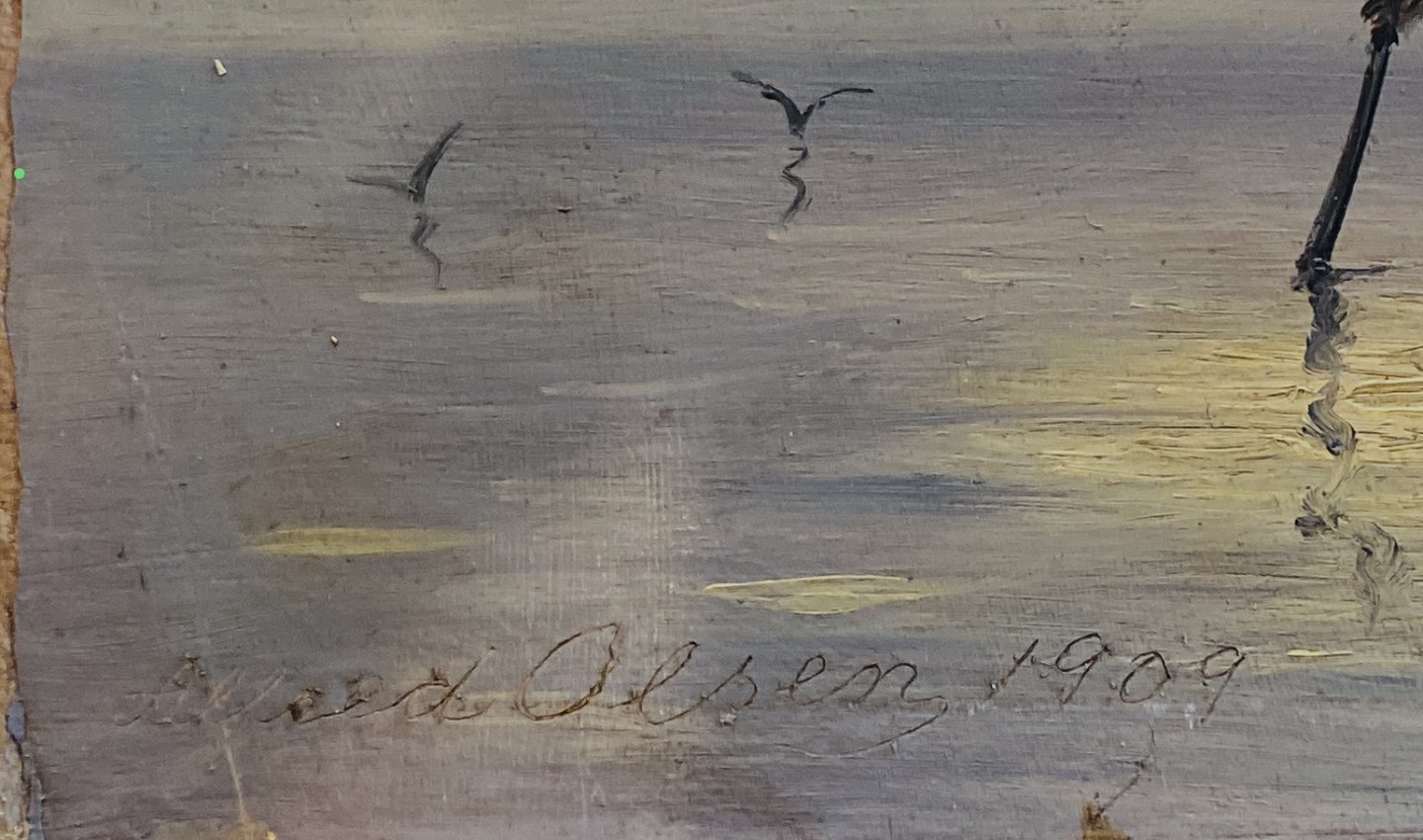 Alfred Olesen. Olie på plade. Marine, motiv af skib ved solnedgang.
