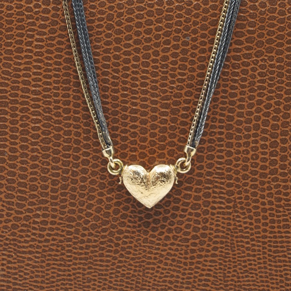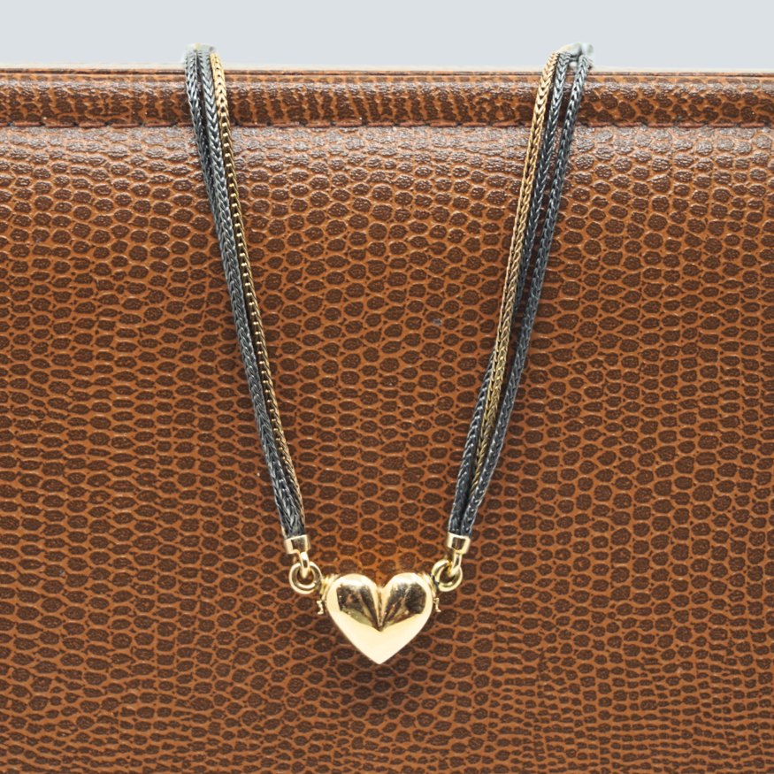 Per Borup; Hjertelås i 14kt. guld, inklusiv kæde af oxideret sølv og 14 kt. guld. Hjertelåsen kan vendes begge vejen og har en side med glat overfalde og en med ru overflade.