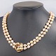 | Charlotte Lynggaard for Ole Lynggaard; Blomsterlås af 14 kt. guld, prydet med to brillantslebne diamanter indfattet i hvidguld. Brillanter i alt 0.10 ct. Farve: Top-Wesselton (G). Klarhed: VS. Diam på låsen: 2,4 cm. Låsen kan bruges til to kæder. Inklusiv dobbelt kæde med perler. L. med kæde og lås: 49 cm. Stemplet "Ole L 585 C.L." Design Charlotte Lynggaard. Dansk design smykke. |