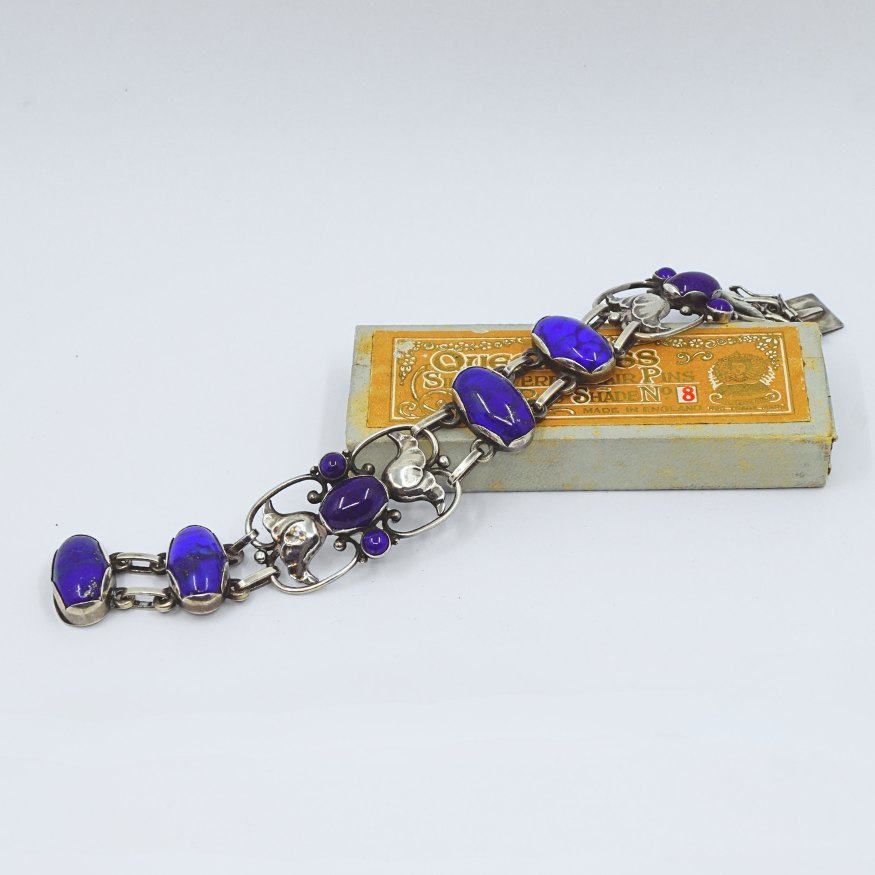 Skønvirke armbånd i sølv. Leddelt og prydet med lapis lazuli.