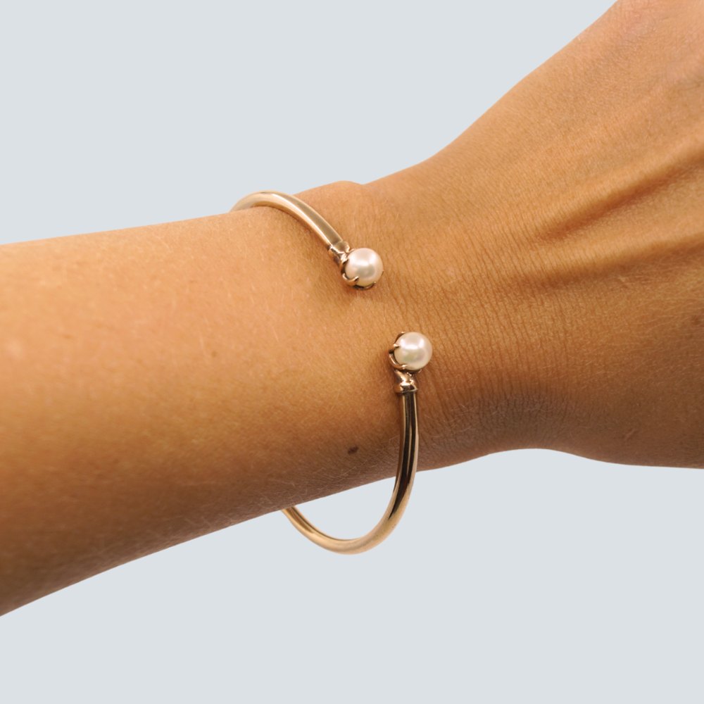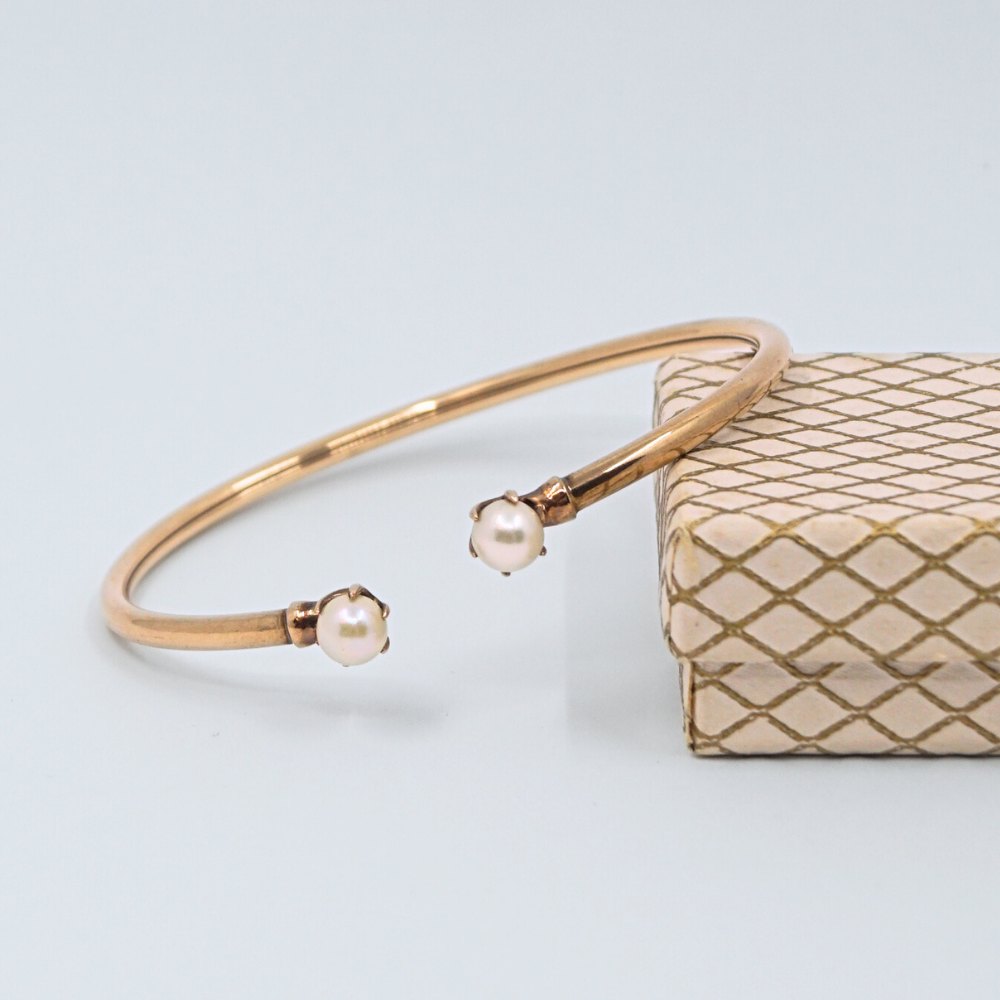 | Bernhard Hertz; Armring af 8 kt. guld. Prydet med to perler. Indvendige mål: 6,1 cm x 5,1 cm. Stemplet "BH BH". Kontakt os gerne, hvis du søger noget specifikt. Hvad du ser på vores hjemmeside, er blot et udvalg af det, som vi har. |